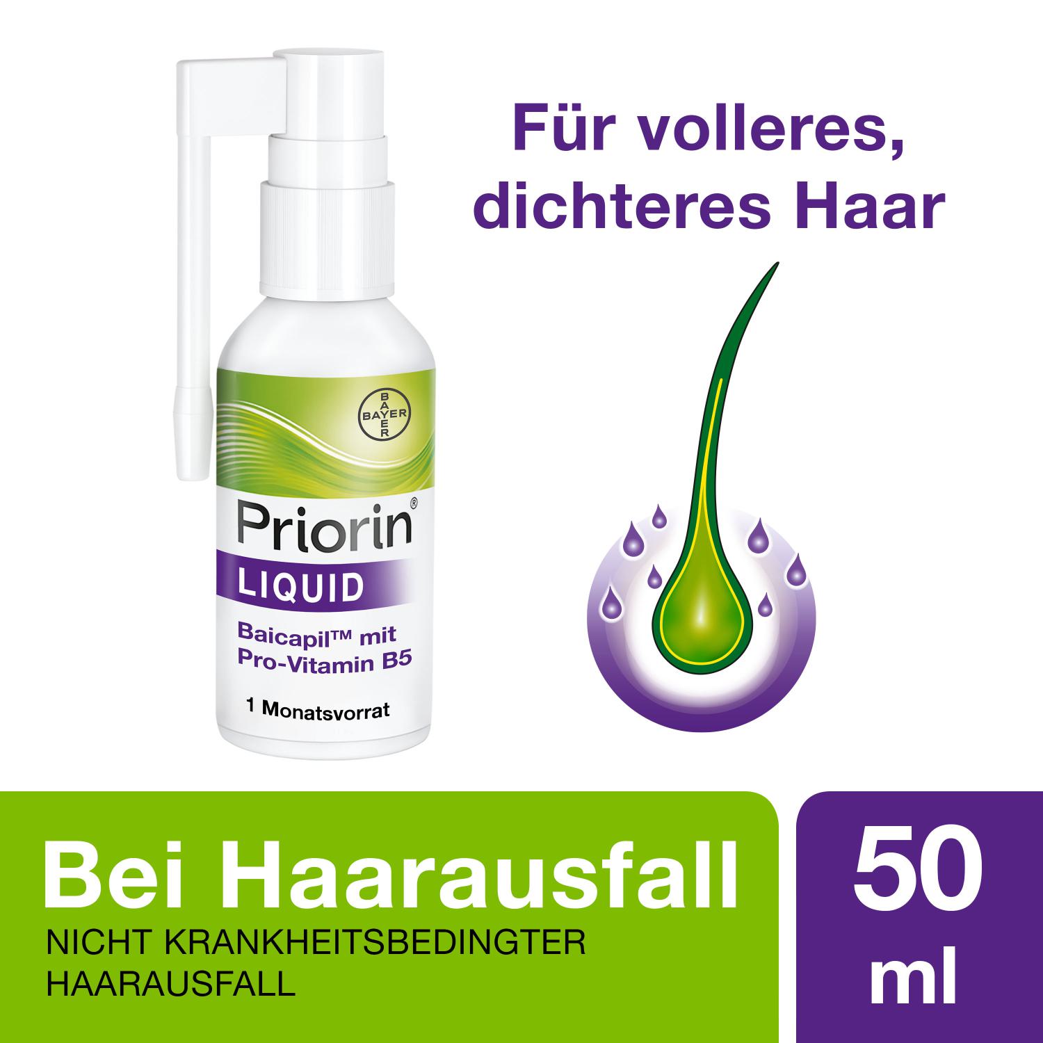 Bei Haarausfall* oder dünner werdendem Haar, kann Priorin® Liquid wertvolle Hilfe bieten. Es unterstützt den Haarwachstumszyklus und trägt so zum natürlichen Wachstum der Haare bei – für spürbar dichteres und volleres Haar. Priorin® Liquid enthält den Wirkstoffkomplex Baicapil® auf pflanzlicher Basis (bestehend aus Baikal-Helmkraut-Wurzelextrakt, Soja- und Weizenkeimextrakten) und das hautpflegende Pro-Vitamin B5. Die Anwendung ist ganz einfach: aufsprühen, einmassieren, fertig. Priorin® Liquid riecht angenehm und hinterlässt keine Rückstände, daher kann das Haar nach der Anwendung wie gewohnt frisiert und gestylt werden. Für einen sichtbareren Erfolg nach 12 Wochen**.
