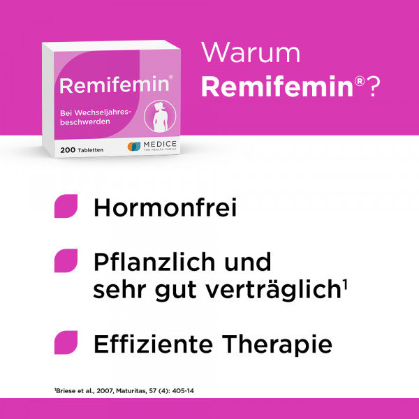 Auch im weiteren Verlauf der Wechseljahre, wenn die Beschwerden weitestgehend unter Kontrolle sind bzw. wieder abklingen, ist das sanfte und zuverlässige Remifemin die richtige Lösung.