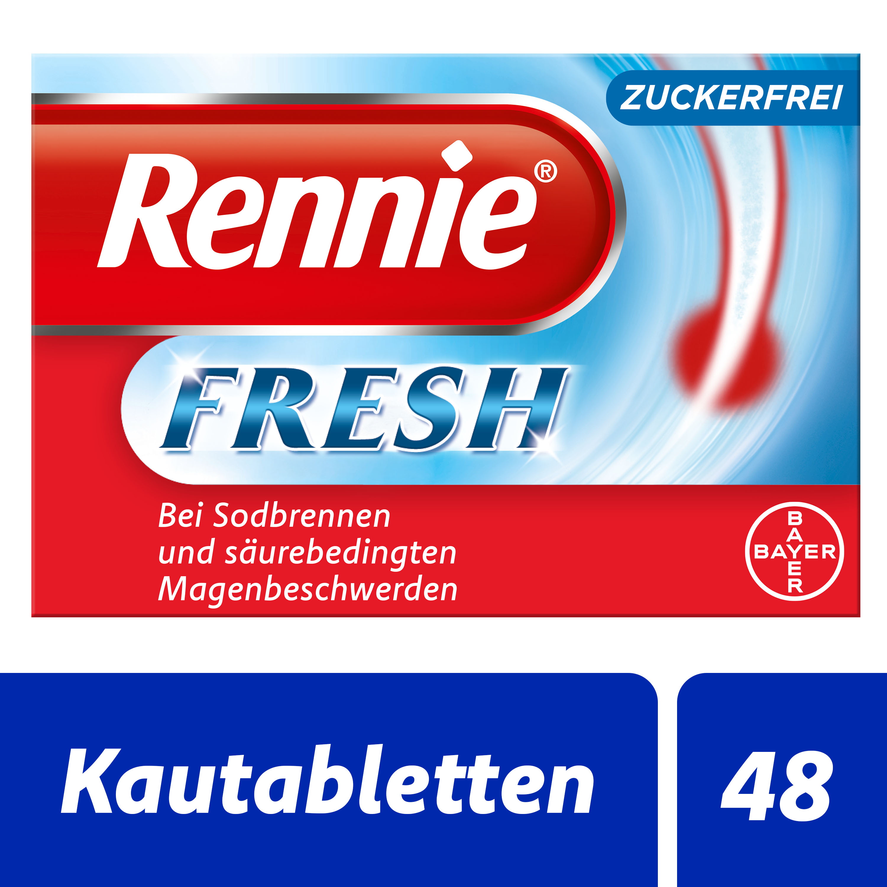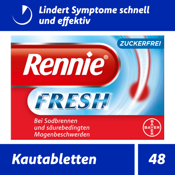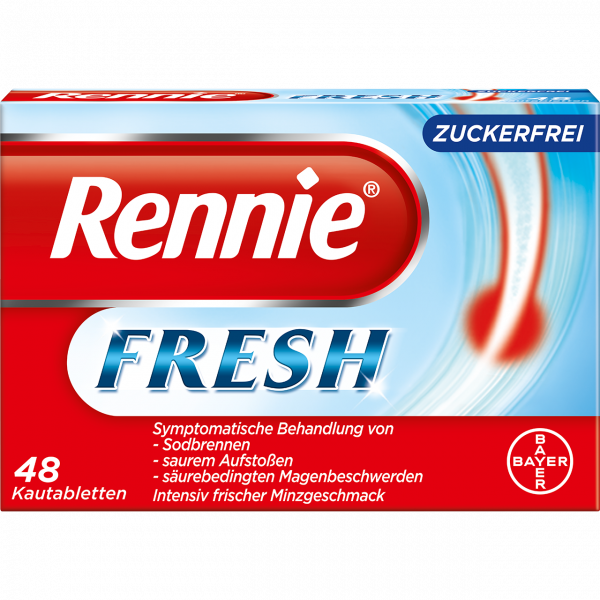 Den Klassiker gegen Sodbrennen gibt es jetzt auch mit extrafrischem Minzgeschmack für extrafrischen Atem. Rennie® FRESH enthält die bewährten Rennie® Wirkstoffe Calcium- und Magnesiumcarbonat und ist dabei frei von Zucker. Damit ist Rennie® FRESH die richtige Wahl für Diabetiker und Menschen, die ihre Symptome ohne Zuckerzusatz wirkungsvoll bekämpfen möchten. Aufgrund der guten Verträglichkeit ist Rennie® FRESH auch für Schwangere geeignet.