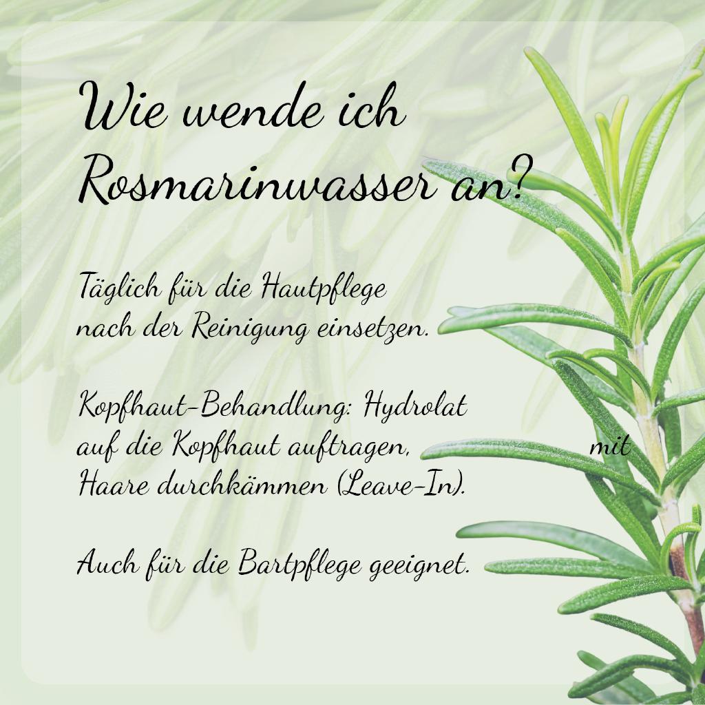 Täglich zur Pflege auf Haut und Haare auftragen. Das Casida Rosmarinwasser Haut & Haare ist ein Leave-In-Produkt und muss nicht ausgewaschen werden.