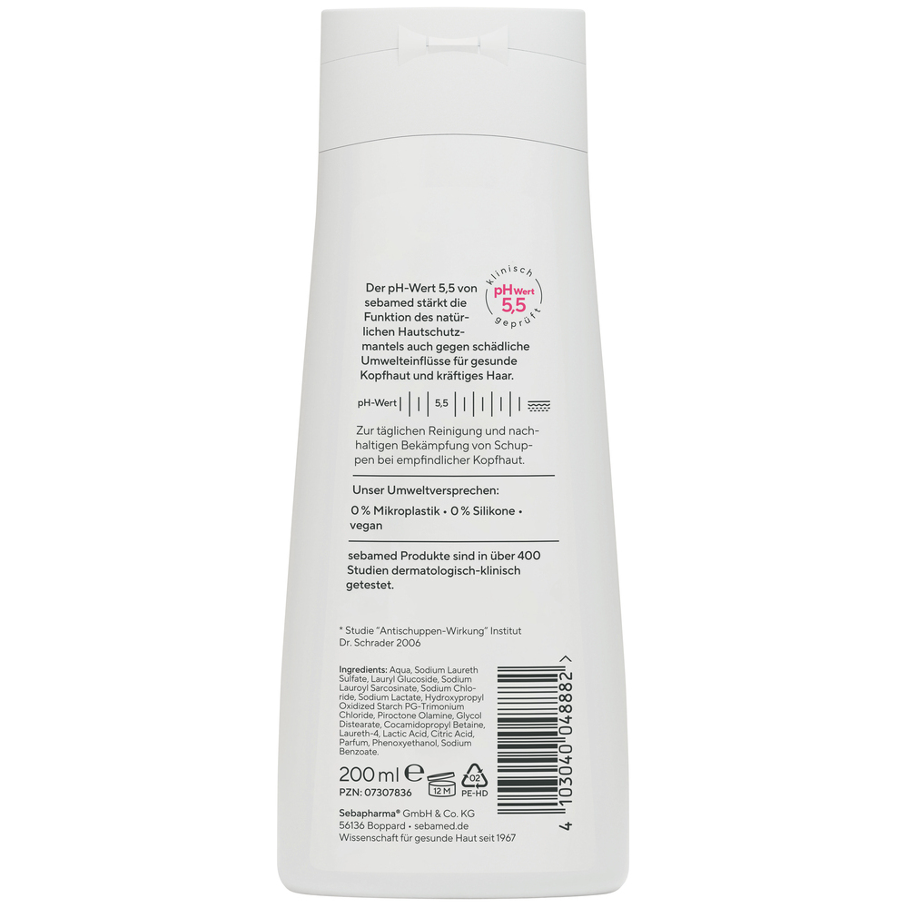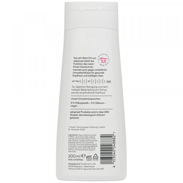 sebamed Antischuppen Shampoo mit seinem Wirkstoff Piroctone Olamine beseitigt nachweislich Schuppen. Eine Studie bestätigt: 50% weniger Kopfschuppen schon nach 14 Tagen*. Die speziell entwickelte Tensidkombination hilft, Reizung und Austrocknung von Kopfhaut und Haar zu vermindern. Der pH-Wert 5,5 fördert die Funktion des natürlichen Hautschutzmantels und trägt zur Gesunderhaltung der Kopfhaut bei.