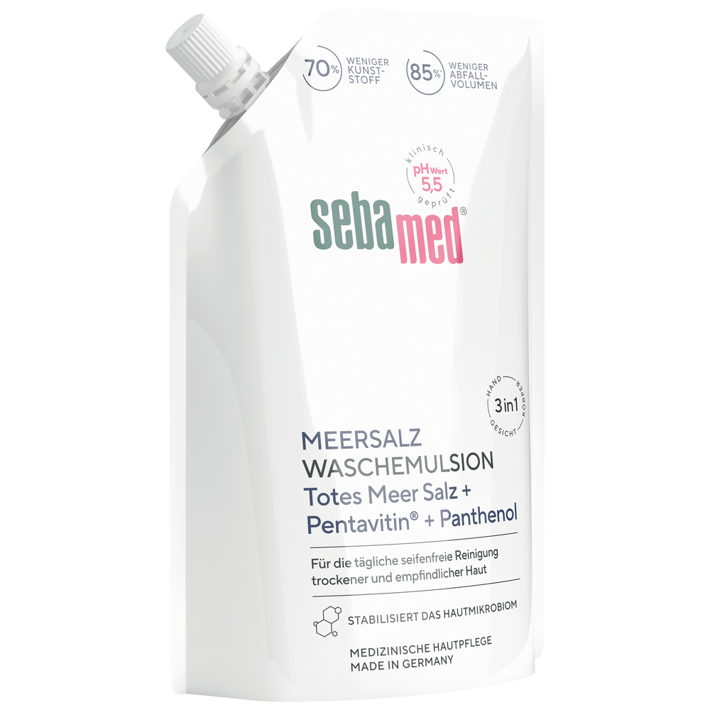 SEBAMED Meersalz Wasch-Emulsion 400 ml Nachfüllbeutel, für die tägliche seifenfreie Reinigung für Gesicht, Körper und Hände, wirkt Austrocknung entgegen, mit original Totes Meer Salz Mineralien