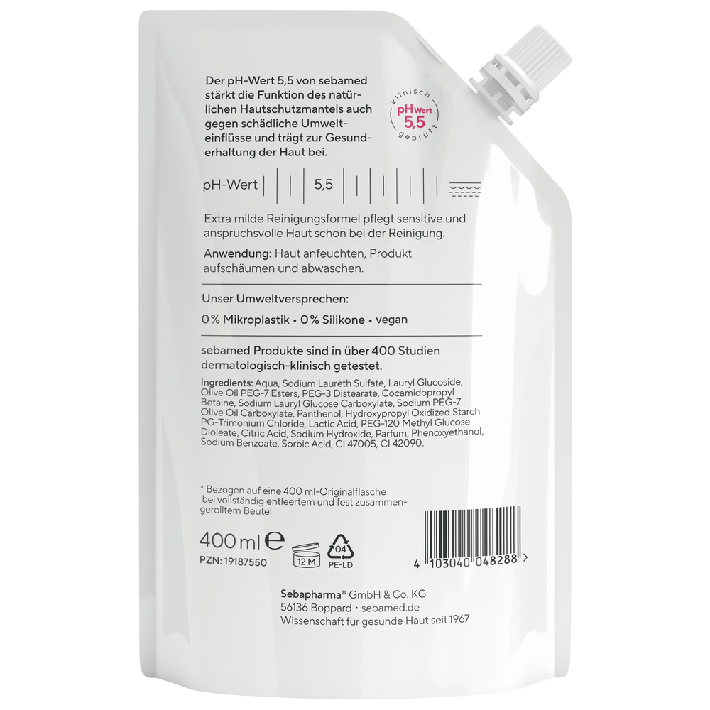- GUT FÜR DIE UMWELT: 70% weniger Kunststoff und 85% weniger Abfallvolumen bezogen auf eine 400 ml Originalflasche bei vollständig entleerten und zusammengerollten Beutel • FÜR GESUNDE HAUT: Der pH-Wert 5,5 von sebamed stärkt die Funktion des natürlichen Hautschutzmantels auch gegen schädliche Umwelteinflüsse und trägt zur Gesunderhaltung der Haut bei