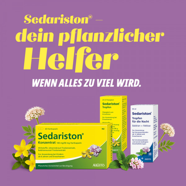 Sedariston® hilft in Belastungssituationen wirksam und ganz natürlich bei guter Verträglichkeit – und das schon seit Jahrzehnten. Die Kapseln enthalten eine einzigartige Kombination wertvoller Pflanzenextrakte, aus Johanniskraut und Baldrianwurzel. Deren Zwei-Phasen-Wirkung hilft in schwierigen Lebensphasen, in starken Belastungssituationen innerlich stark und stabil zu bleiben oder es zu werden. Bereits nach wenigen Tagen der Einnahme kann die wohltuende Wirkung der pflanzlichen Wirkstoffe spürbar sein. Auch Kinder können Phasen durchleben, in denen sie Hilfe benötigen, Belastungssituationen zu bewältigen. Sedariston® ist auch für Kinder ab 6 Jahren zugelassen. Rein pflanzliche Hilfe auch bei kindlicher Unruhe. Es kann bei Überlastungsreaktionen in der Schule eingenommen werden, hilft die Motivation Ihres Nachwuchses zu fördern, oder aber zur Linderung von Nervosität vor Flügen oder Prüfungen. Die Wirksamkeit und Verträglichkeit des pflanzlichen Arzneimittels Sedariston® haben klinische Studien bestätigt¹.