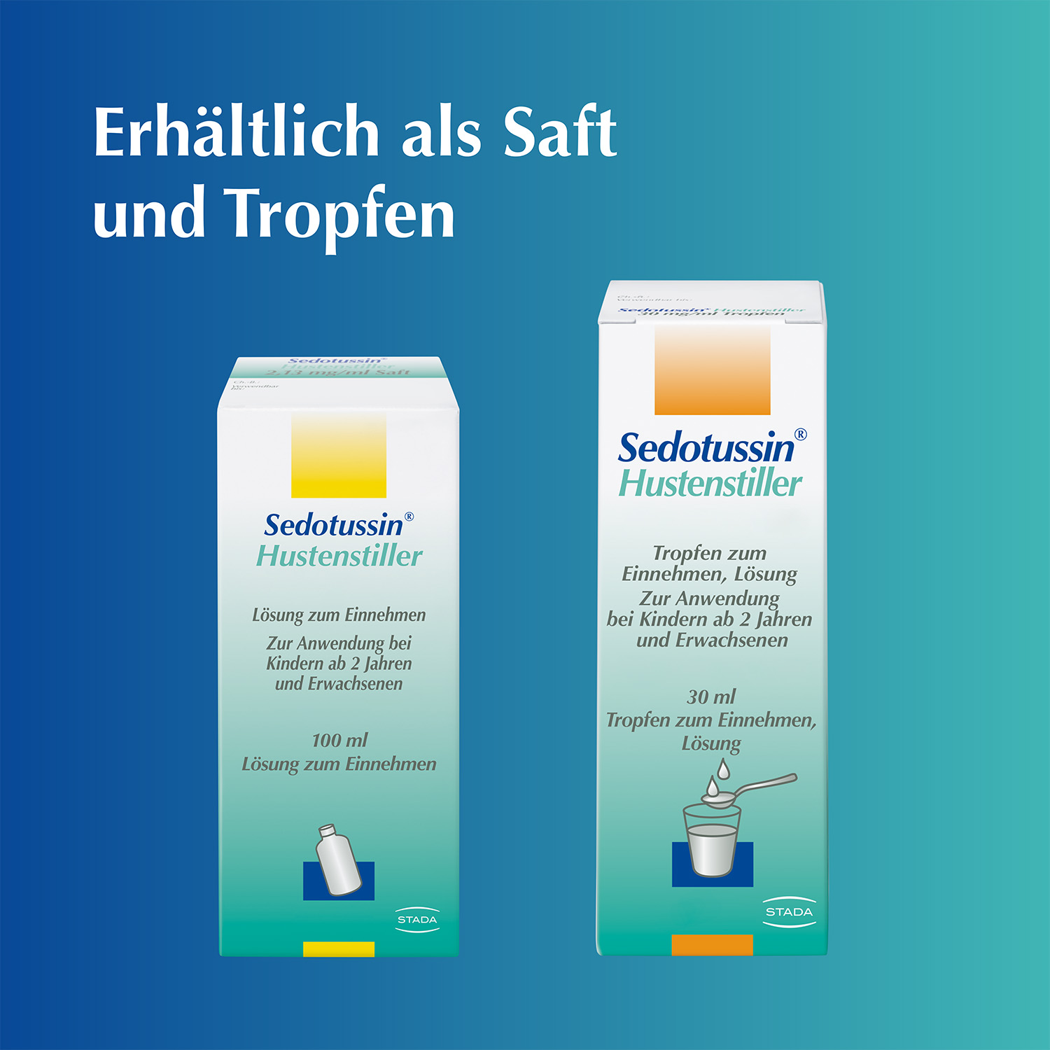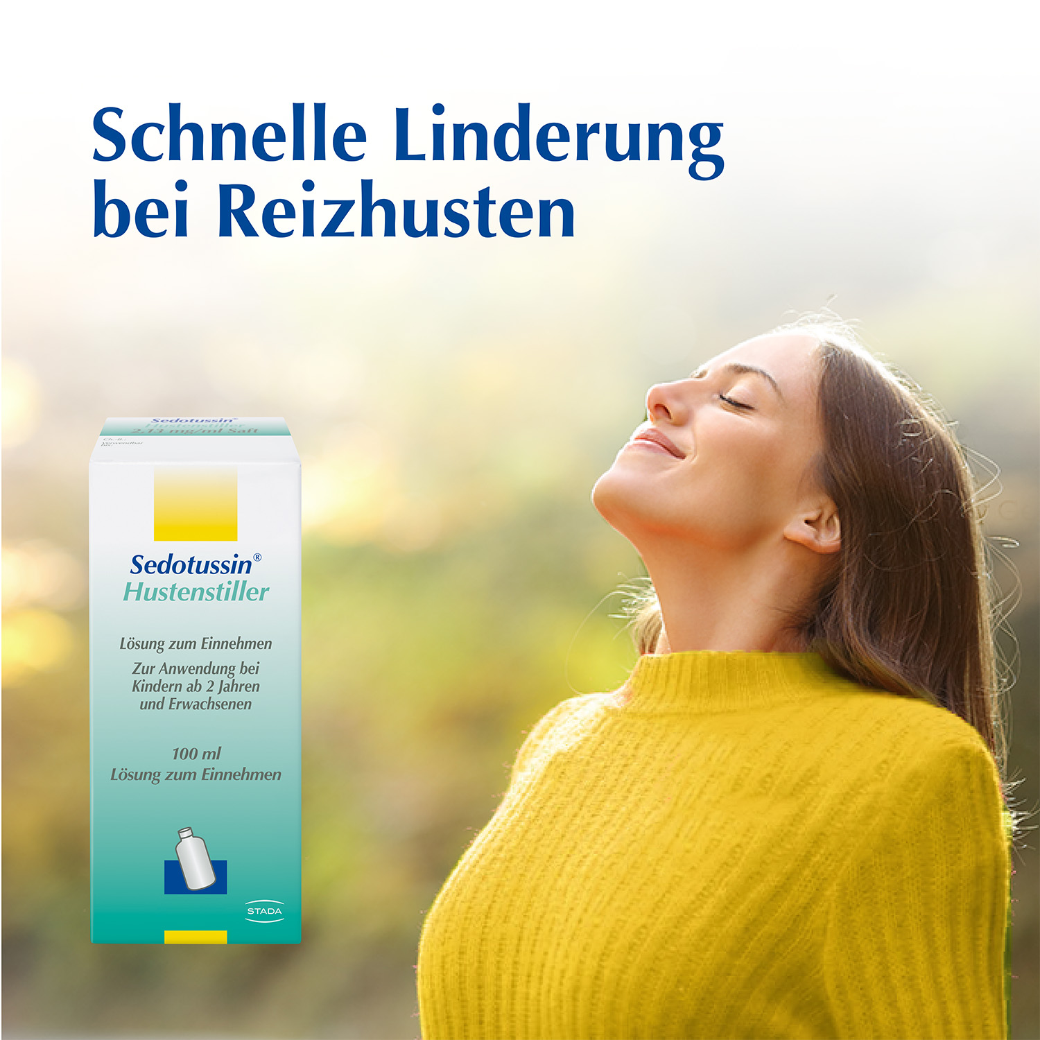 Sedotussin® Hustenstiller Saft verschafft schnelle und langanhaltende Linderung bei Reizhusten, indem die gereizten Stellen im Hals befeuchtet werden. Bereits nach 10 Minuten tritt die erste Wirkung auf, welche bis zu 6 Stunden anhält. Das Arzneimittel mit dem Wirkstoff Pentoxyverin ist sehr gut verträglich, es beeinträchtigt nicht die Atmung und kann somit auch bei Asthma und COPD eingenommen werden. Es ist für