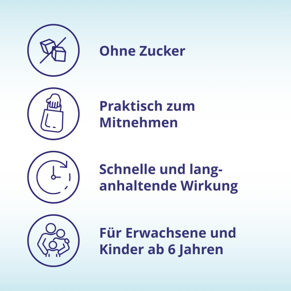 | Jugendliche ab 12 Jahren und Erwachsene | 1-3 Pastillen | mehrmals täglich (max. 12 Pastillen pro Tag) | im Abstand von 4-6 Stunden, unabhängig von der Mahlzeit |