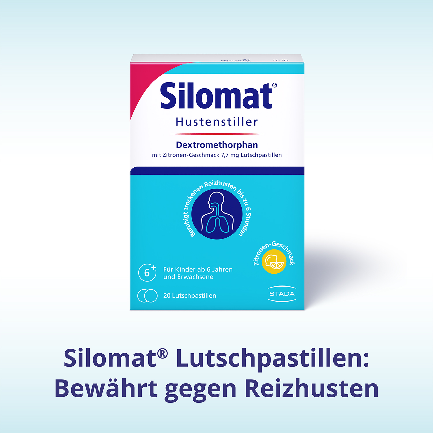 Silomat® Lutschpastillen mit Zitronengeschmack sollten nur bei trockenem Husten ohne Schleimbildung angewandt werden.
