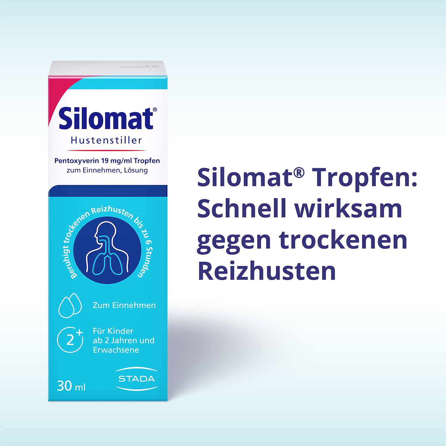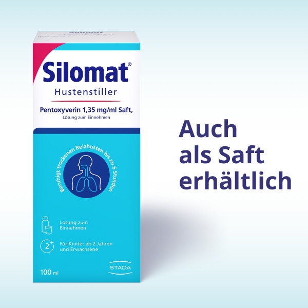 einer Erkältung geschieht dies schon auf geringste Reize hin. So kommt es zu ständigem Husten, obwohl es eigentlich nicht nötig ist. SILOMAT® TROPFEN - WIRKSAM UND GUT VERTRÄGLICH Der Wirkstoff in Silomat® Hustenstiller Pentoxyverin Tropfen dämpft die Wahrnehmung des Hustenreizes. So können sich die Schleimhäute in den Bronchien erholen. Die Wirkung tritt bereits nach 10-20 Minuten ein und hält 4-6 Stunden an. Die Einnahme eignet sich auch ideal vor dem Schlafengehen. Dank der guten Verträglichkeit sind die Tropfen bereits für Kinder ab 2 Jahren geeignet.