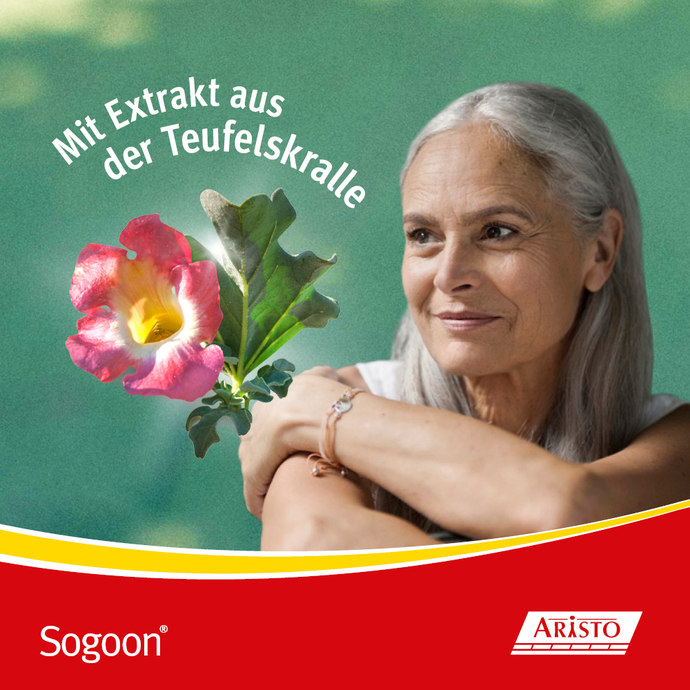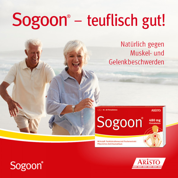 Bei Arzneimittel Sogoon® Filmtabletten handelt es sich um ein pflanzliches Antirheumatikum. Die rezeptfreien Filmtabletten sind zugelassen zur unterstützenden Therapie bei Verschleißerscheinungen des Bewegungsapparates. Sie hemmen Entzündungen und können die Schmerzen bei Gelenkverschleiß lindern. Eine Filmtablette enthält 480 Milligramm Trockenextrakt aus der Teufelskrallenwurzel.