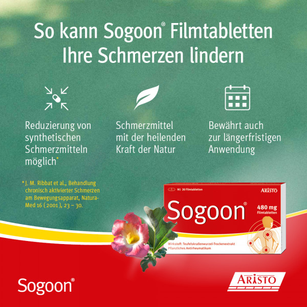 Bei Arzneimittel Sogoon® Filmtabletten handelt es sich um ein pflanzliches Antirheumatikum. Die rezeptfreien Filmtabletten sind zugelassen zur unterstützenden Therapie bei Verschleißerscheinungen des Bewegungsapparates. Sie hemmen Entzündungen und können die Schmerzen bei Gelenkverschleiß lindern. Eine Filmtablette enthält 480 Milligramm Trockenextrakt aus der Teufelskrallenwurzel.