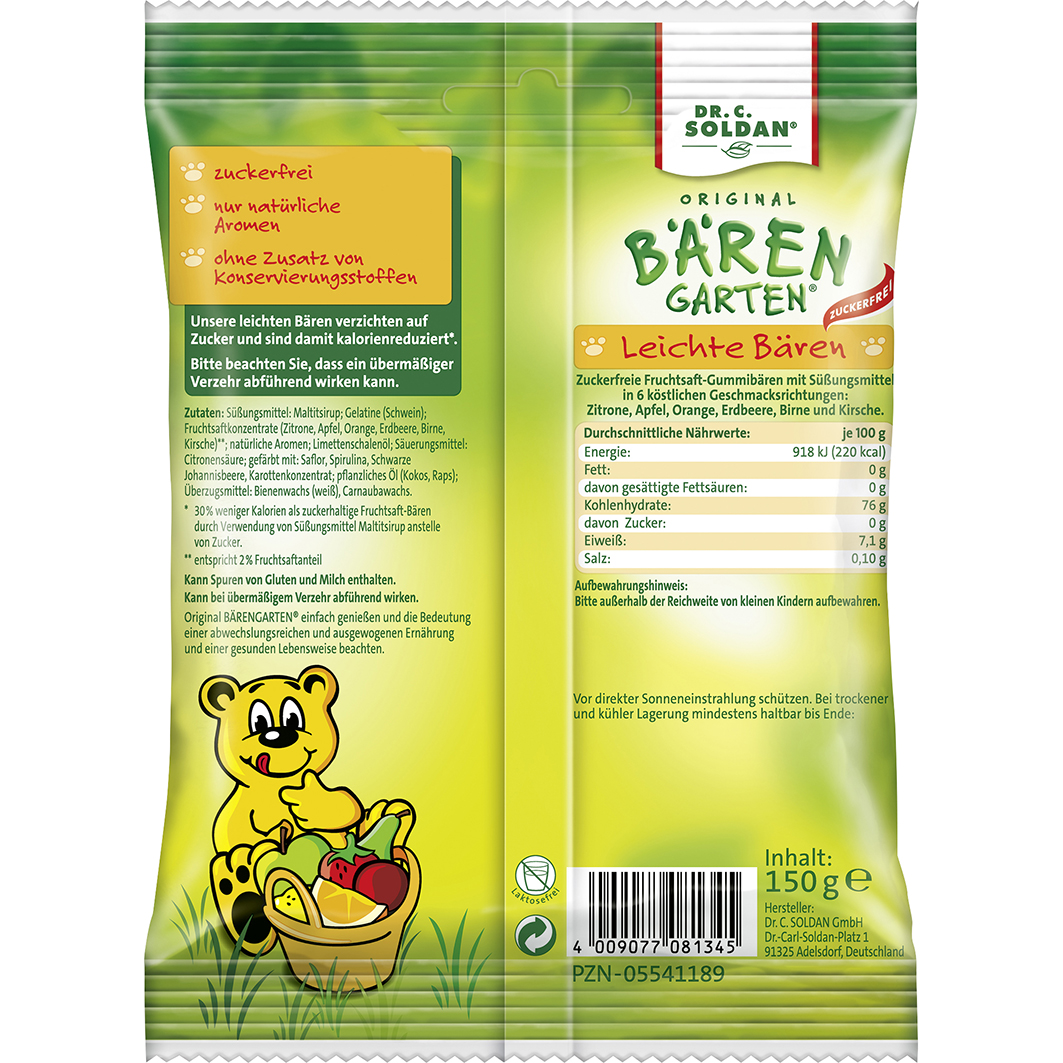 "Süßungsmittel: Maltitsirup, Gelatine, Säuerungsmittel: Citronensäure, Fruchtsaftkonzentrate (Zitrone, Apfel, Orange, Erdbeere, Birne, Kirsche) 0,4 g/100 g**, natürliche Aromen, Limettenschalenöl, gefärbt mit: Saflor-, Spirulina-, Schwarze Johannisbeere-, Karotten-, Kürbis- und Apfelkonzentrat, Kokosöl, Überzugsmittel: Bienenwachs weiß, Carnaubawachs. * 30% weniger Kalorien als zuckerhaltige Fruchtsaft-Bären durch Verwendung von Süßungsmittel Maltitsirup an Stelle von Zucker. ** entspricht 2% Fruchtsaftanteil"