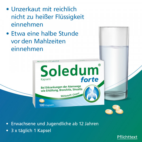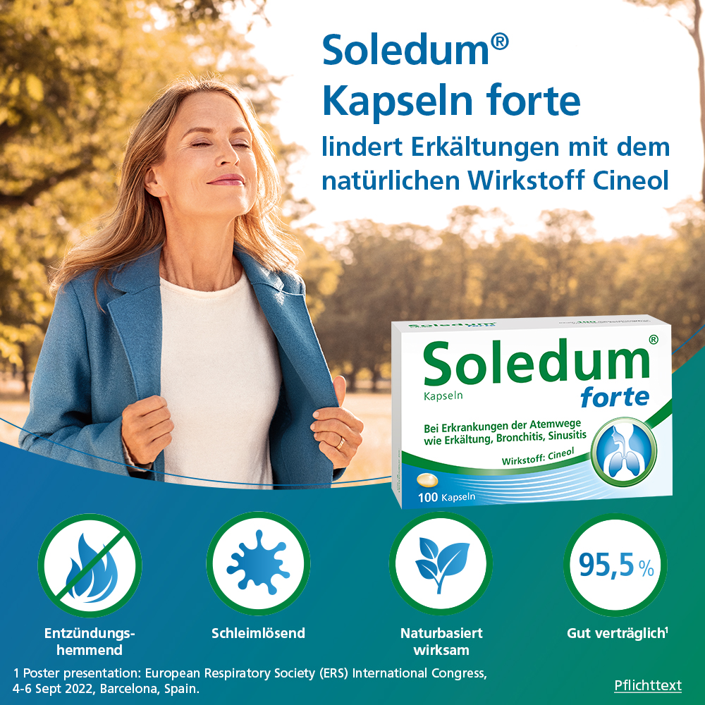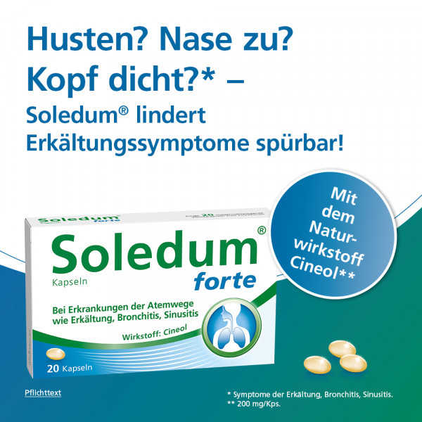 Der naturbasierte Wirkstoff Cineol wirkt schleimlösend und entzündungshemmend. Sinnvoll ist hierbei der Kontakt von Cineol mit dem Wirkort - der angegriffenen Schleimhaut der Atemwege. Dieser Kontakt erfolgt dadurch, dass Cineol nach der Einnahme der Soledum® Kapseln forte auf natürlichem Weg über die Blutbahn auch zur Lunge transportiert wird und dort abgeatmet wird.