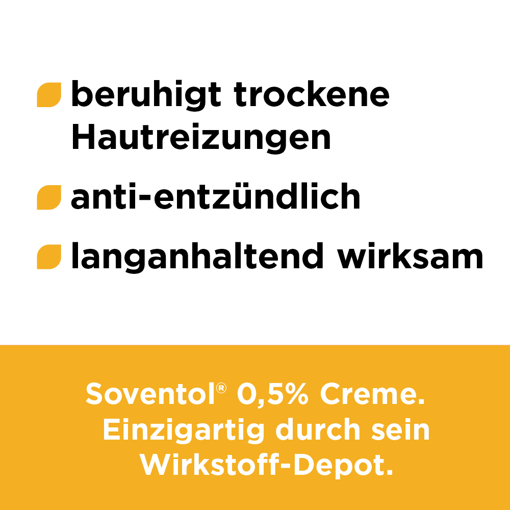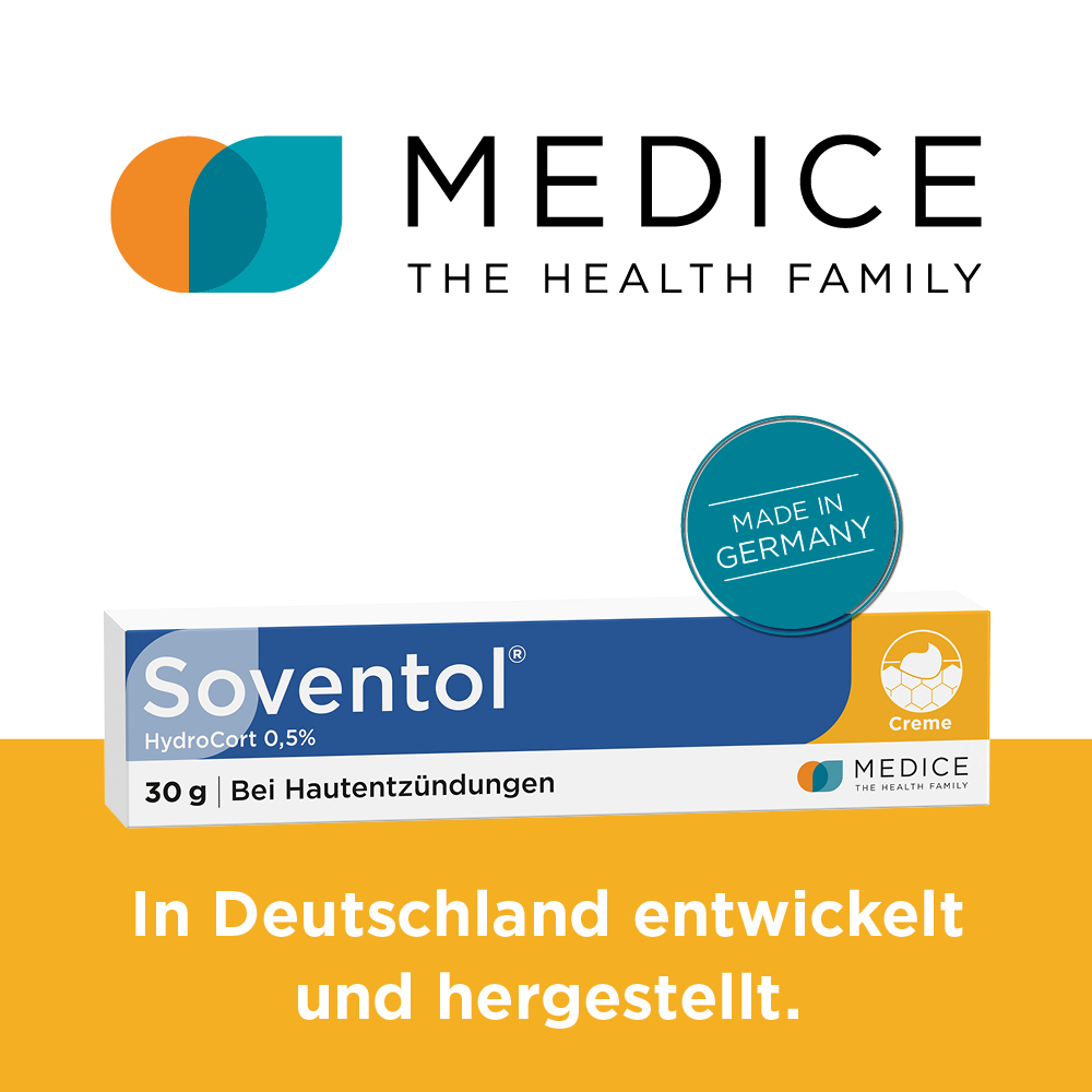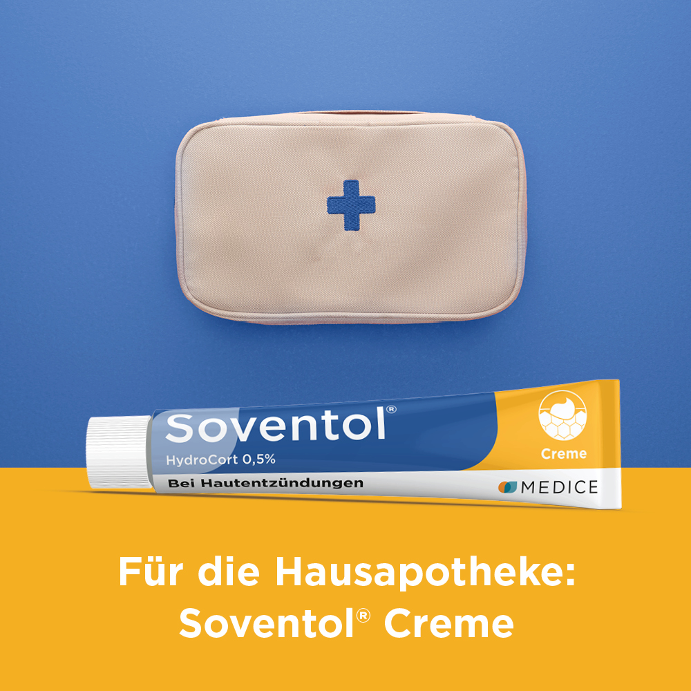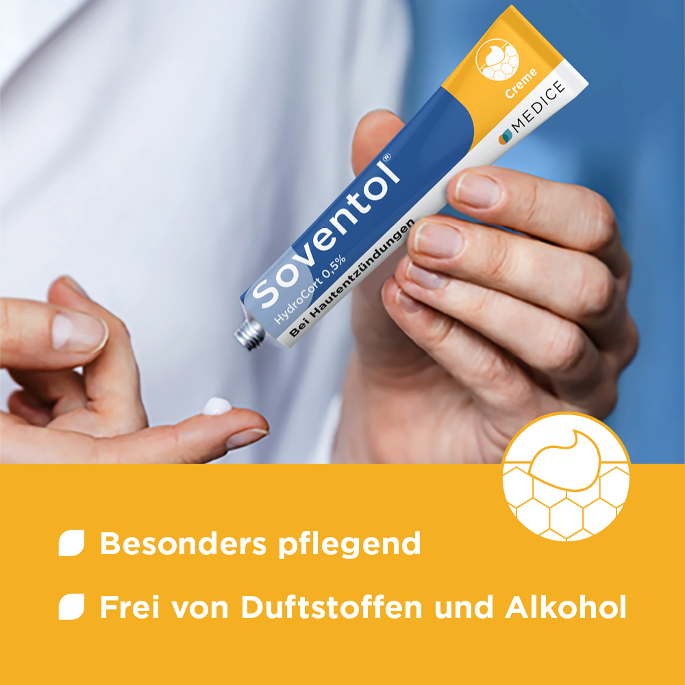 Bei ausgeprägten und chronisch-entzündlichen Hautproblemen (Hautallergien, Hautentzündungen, Ekzemen, leichten Formen von Neurodermitis) bietet Soventol® HydroCort 0,5% Creme zuverlässige Hilfe. Denn die Creme mit Hydrocortison besitzt juckreizstillende und entzündungshemmende Eigenschaften. Gleichzeitig unterstützt die pflegende Cremegrundlage die Regeneration geschädigter Haut.