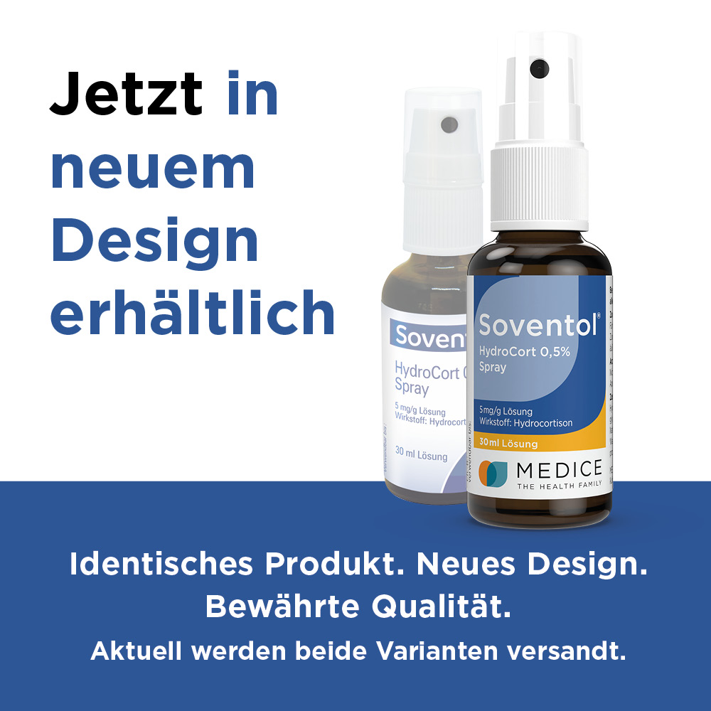 Soventol® HydroCort 0,5% Spray 5 mg/g Lösung. Anwend.: Zur Linder. v. nicht infiz. leichten entzündl., allerg. o. juck. Hauterkr., d. auf eine symptom. Behandl. m. schwach wirks. Glucocorticosteroiden ansprechen. Eignet sich vorzugsweise zur Anwend. auf normaler od. fettiger Haut. Warnhinweis: Enthält Propylenglycol. Zu Risiken und Nebenwirkungen lesen Sie die Packungsbeilage und fragen Sie Ihren Arzt oder Apotheker; 07/2017.