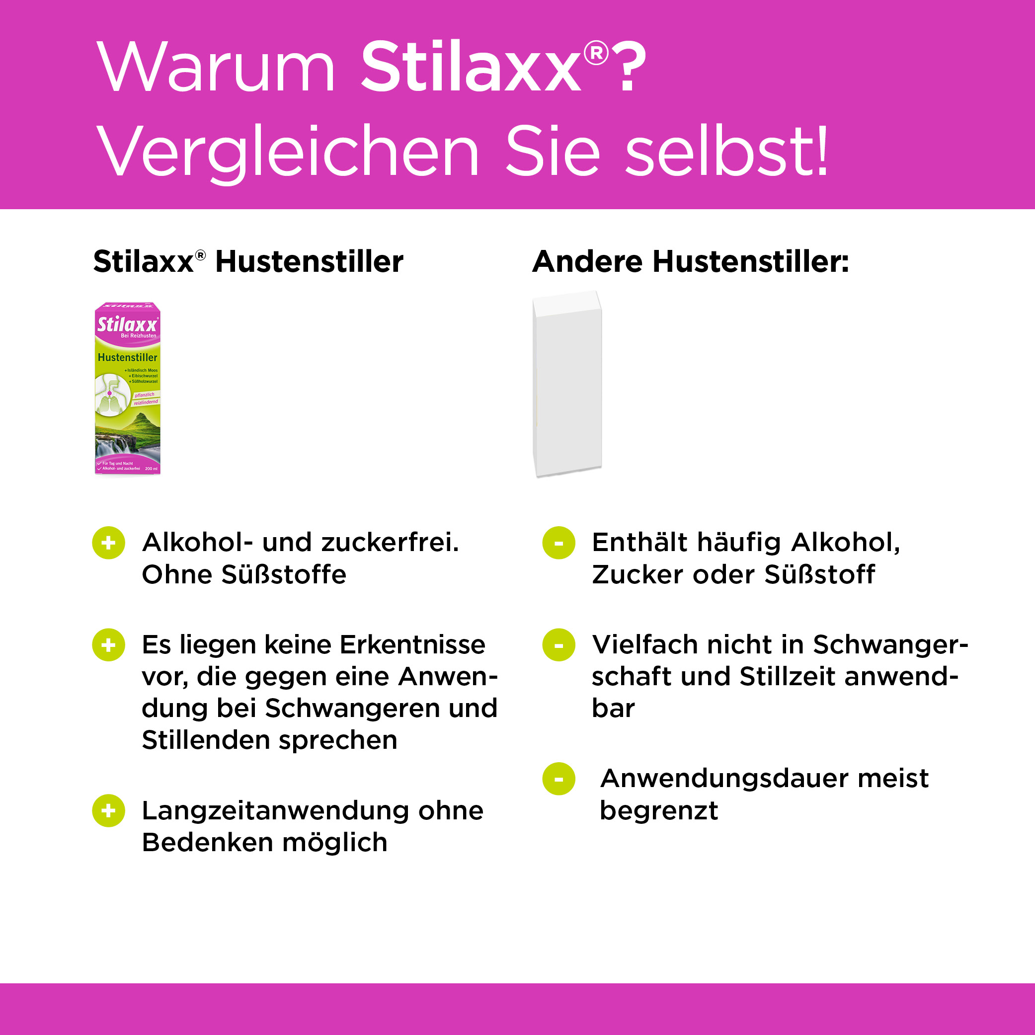 Auf Grund der guten Verträglichkeit kann der Stilaxx® Hustenstiller bei Bedarf auch über einen längeren Zeitraum angewandt werden.