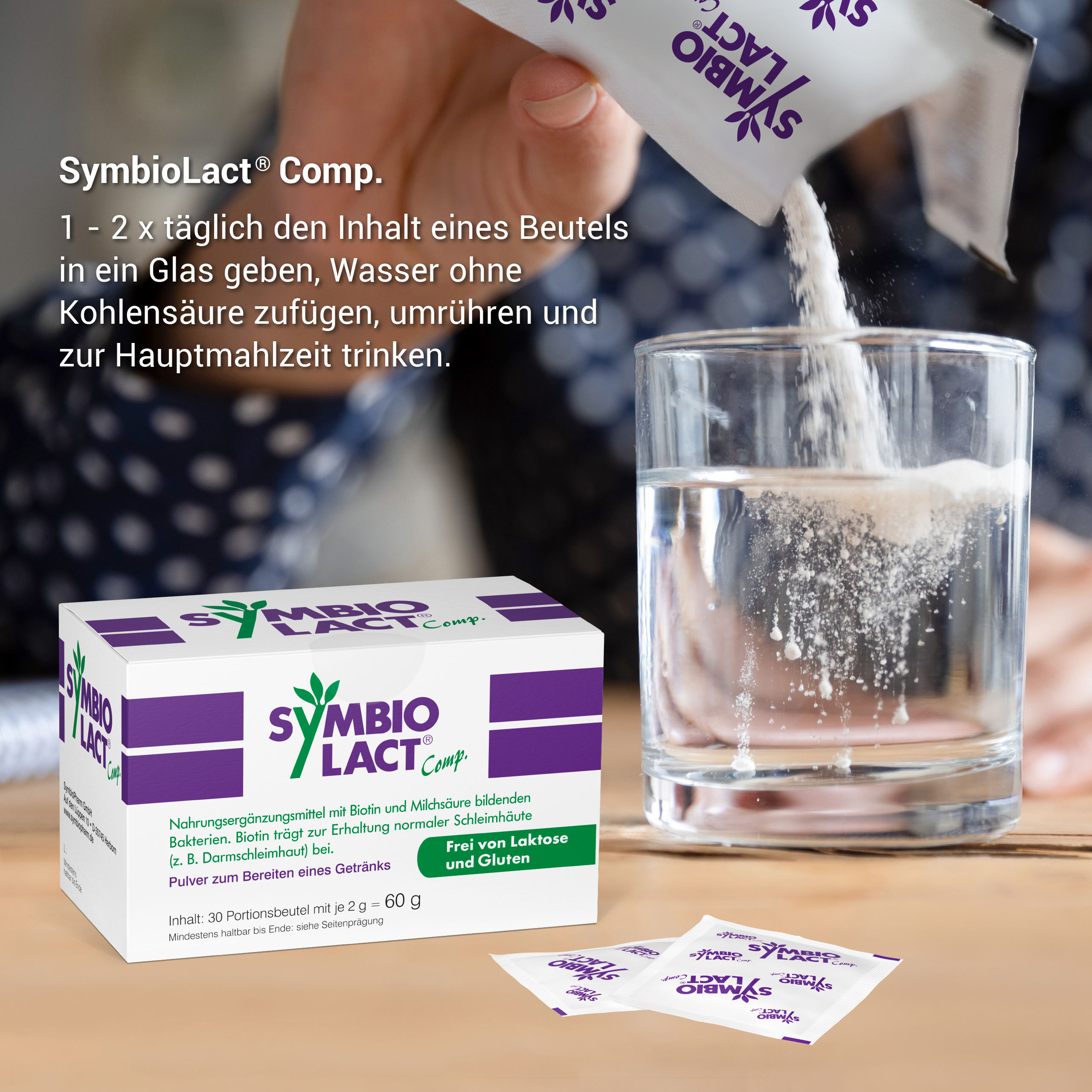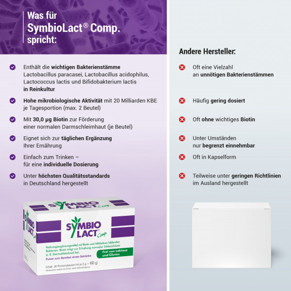 Neben den Milchsäurebakterien enthält SymbioLact® das wasserlösliche Vitamin Biotin. Biotin ist für den Stoffwechsel der Körperzellen wichtig. Gerade sehr aktive Gewebe wie die Schleimhaut benötigen Biotin, damit Zellteilungsprozesse geregelt ablaufen können. Die Darmschleimhaut ist die größte Schleimhaut des Körpers, alle zwei bis drei Tage regeneriert sie sich komplett. Um diese enorme Stoffwechselleistung aufrecht erhalten zu können, muss der Körper mit all den Nahrungsbestandteilen gut versorgt sein, die für den Aufbau neuer Gewebestrukturen wichtig sind.