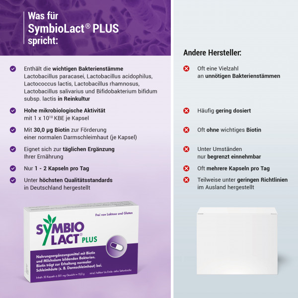 SymbioLact® PLUS enthält sechs verschiedene Stämme natürlicher Darmbakterien aus dem oberen und unteren Verdauungstrakt. Die Bakterien sind gefriergetrocknet und geschützt in der vegetarischen Kapselhülle. Jede Kapsel enthält mindestens 10 Milliarden Bakterienkulturen bzw. 1x1010 koloniebildende Einheiten (KBE) - mehr als die meisten vergleichbaren Produkte.