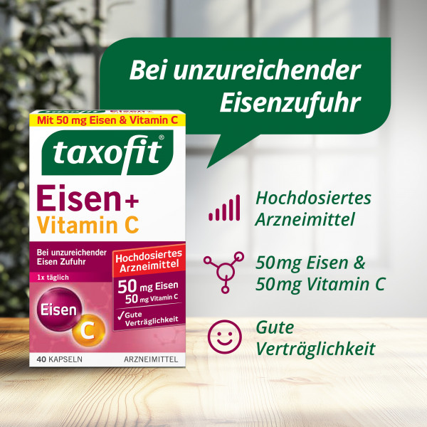Eisen gehört zu den essenziellen Spurenelementen, die im Körper nur in geringen Mengen vorommen. Wird nicht genügend Eisen zugeführt, können verminderte Leistungsfähigkeit und Ermüdung die Folge sein. Um einem Eisenmangel, bedingt durch unzureichende Eisenzufuhr, vorzubeugen und den Körpereigenen Eisenstatus zu stabilisieren, gibt es taxofit® Eisen + Vitamin C - mit der sinnvollen Kombination von Eisen und Vitamin C bekommt der Körper genau die Stärkung, die er benötit, wenn zu wenig Eisen aufgenommen wurde. Das gut bioverfügbare Eisen II kann im Gegensatz zu Eisen aus der Nahrung direkt in den Eisenstoffwechsel eingeschleust werden. Die Zugabe von Vitamin C begünstigt die Aufname von Eisen in dem Organismus.