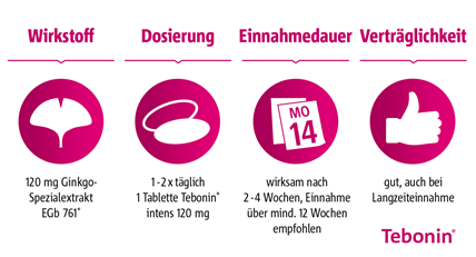 Zur Linderung der Beschwerden wird empfohlen, täglich ein bis zwei Tabletten Tebonin® intens 120 mg einzunehmen, und zwar über mindestens zwölf Wochen. Auch bei längerer Einnahme ist der Spezialextrakt EGb 761® gut verträglich.