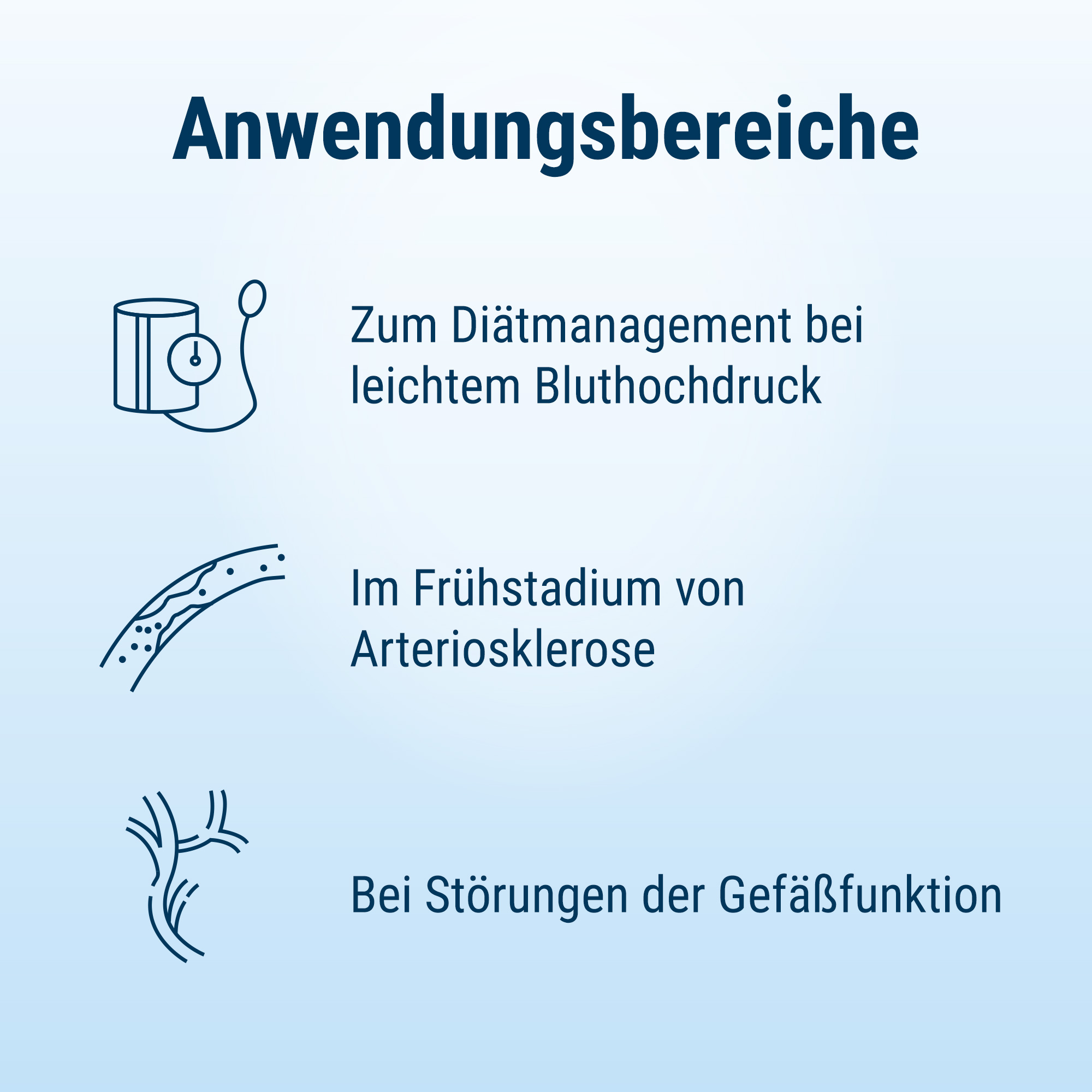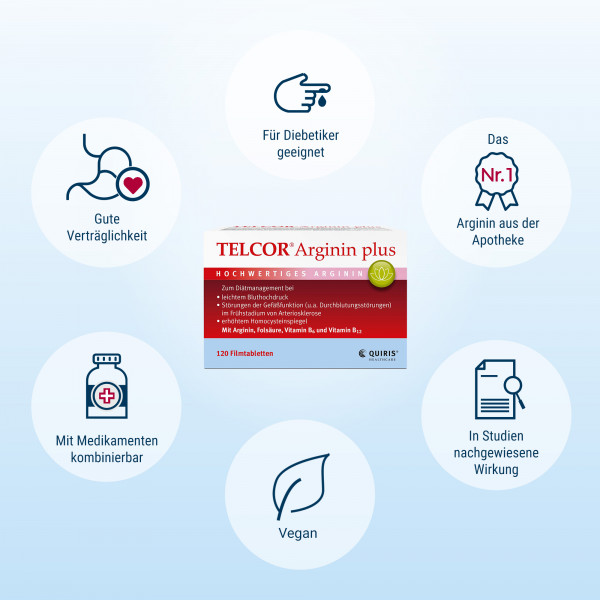 Zur diätetischen Behandlung von: leichtem Bluthochdruck Störungen der Gefäßfunktion (u. a. Durchblutungsstörungen) im Frühstadium von Arteriosklerose erhöhtem HomocysteinspiegelAufgrund der sehr guten Verträglichkeit kann Telcor® Arginin plus zusammen mit anderen Medikamenten, wie z. B. vom Arzt verordneten Blutdrucksenkern, eingenommen werden und ist für eine Langzeitanwendung geeignet. Die Anwendung ersetzt nicht die vom Arzt verordneten Medikamente.Für Diabetiker empfohlen! Mit Telcor® Arginin plus werden dem Körper sinnvoll abgestimmte Mengen an Arginin und B-Vitaminen zugeführt, die positive Effekte auf die Gefäß- und Herzgesundheit haben. Unser Körper bildet aus Arginin, in speziellen Zellen der Gefäßinnenwand, den wichtigen Botenstoff Stickstoffmonoxid (NO). Dieser natürliche Botenstoff entspannt die Blutgefäße, unterstützt damit die körpereigene Blutdruckregulation und verbessert die Elastizität der Blutgefäße. So wird das Herz auf natürliche und physiologische Weise entlastet und unterstützt. Als Radikalfänger kann das aus Arginin gebildete NO zudem entzündlichen Prozessen in den Gefäßen entgegenwirken und die Durchblutung mit einer ausreichenden Nährstoff- und Sauerstoffversorgung im gesamten Organismus unterstützen.In Telcor® Arginin plus wird ausschließlich besonders hochgereinigtes Arginin der Premiumqualität PROArgin® mit natürlichem Ursprung eingesetzt. Mit einer speziell entwickelten dreifachen Umkristallisation wird höchste Arginin-Reinheit gewährleistet. Diese einzigartige PROArgin®-Qualität gewährleistet in Telcor® Arginin plus die höchsten Sicherheits- und Qualitätsstandards.Das Arginin wird durch eine Fermentation (Bioreaktion) aus pflanzlichen Rohstoffen und damit auf rein natürliche Weise gewonnen. Es entspricht vollständig dem natürlichen Arginin, welches in geringen Mengen auch in vielen Lebensmitteln wie Gemüse, Fleisch und Nüssen vorkommt. Mit der gleichzeitigen Einnahme von B-Vitaminen, insbesondere der Folsäure, werden die ernährungsmedizinischen Effekte von Arginin durch Steigerung der NO-Bildung gefördert. Umso wichtiger ist es, Arginin zusammen mit diesen B-Vitaminen einzunehmen, z. B. mit Telcor® Arginin plus, da diese einzigartige synergistische Nährstoffkombination mehr bewirken kann als die Einnahme der einzelnen Stoffe. Gleichzeitig unterstützen die B-Vitamine den Abbau von unerwünschtem Homocystein und verringern damit den oxidativen Stress.Da gerade für Bluthochdruckpatienten ein möglichst niedriger Homocysteinspiegel wichtig ist, sollte auf eine ausreichende Zufuhr dieser Vitamine geachtet werden. Folsäure, Vitamin B6 und B12 sind vornehmlich in Blattgemüse, aber auch in Vollkornprodukten enthalten.