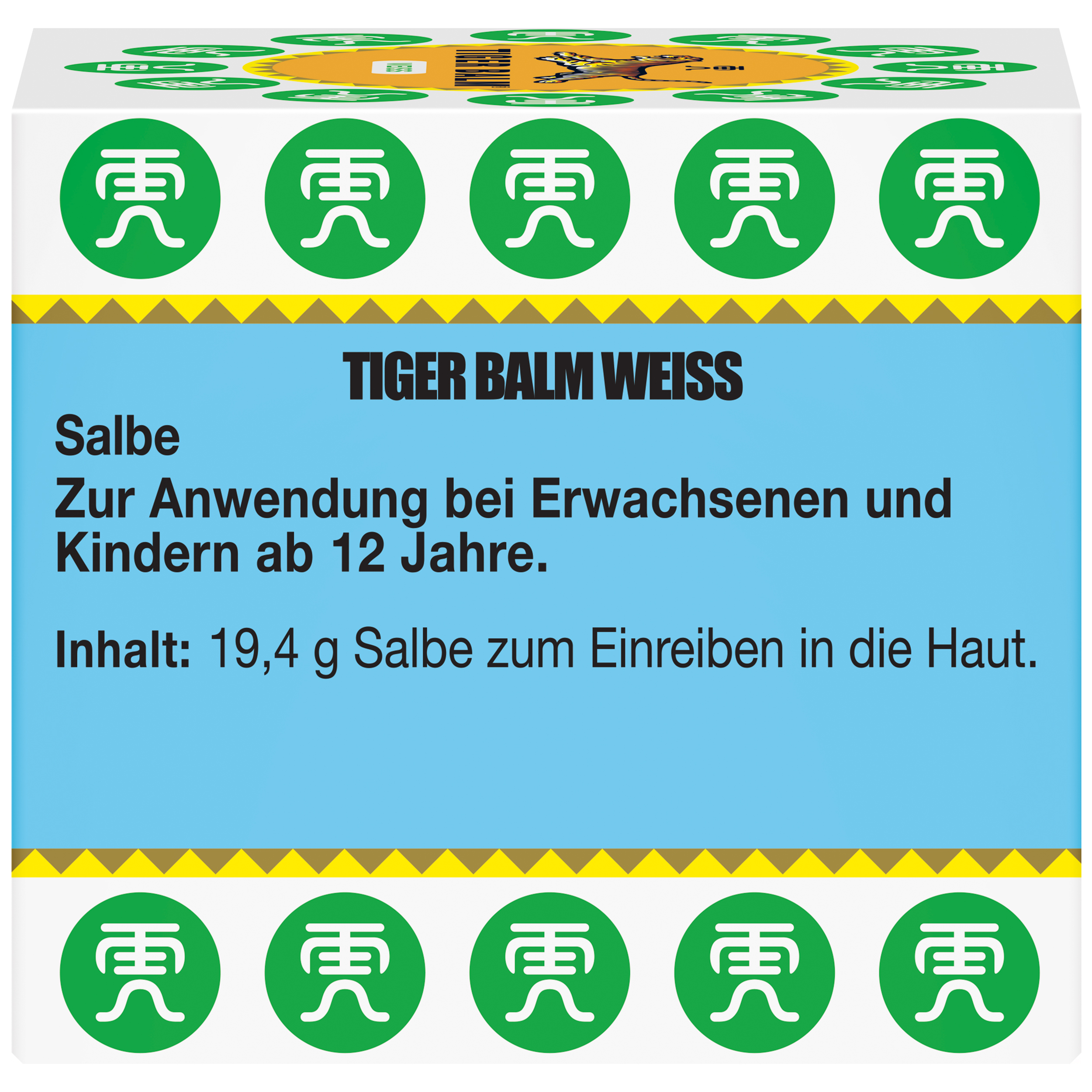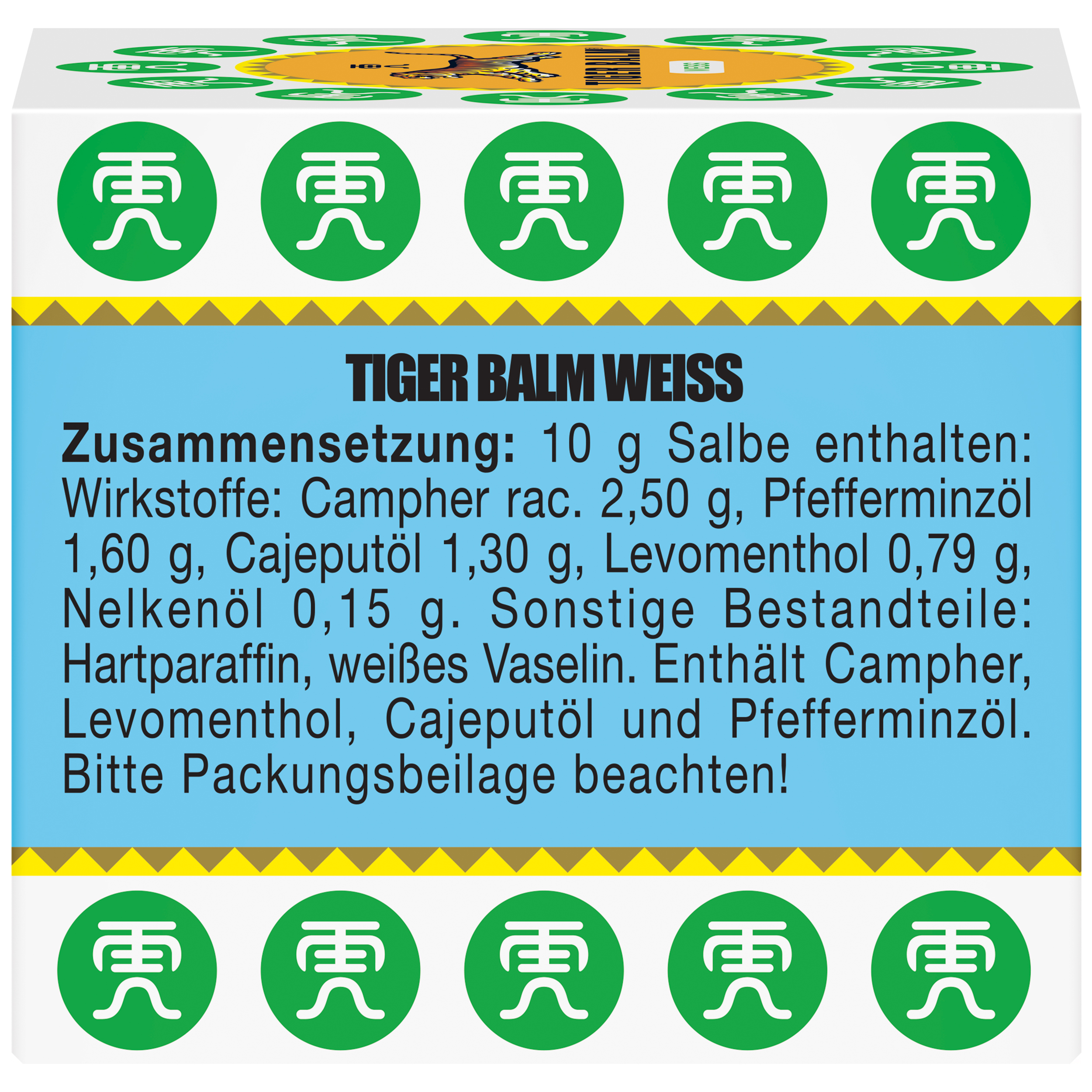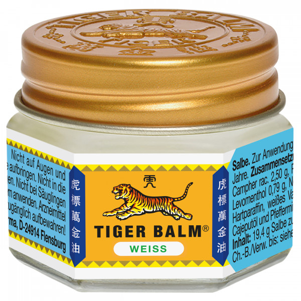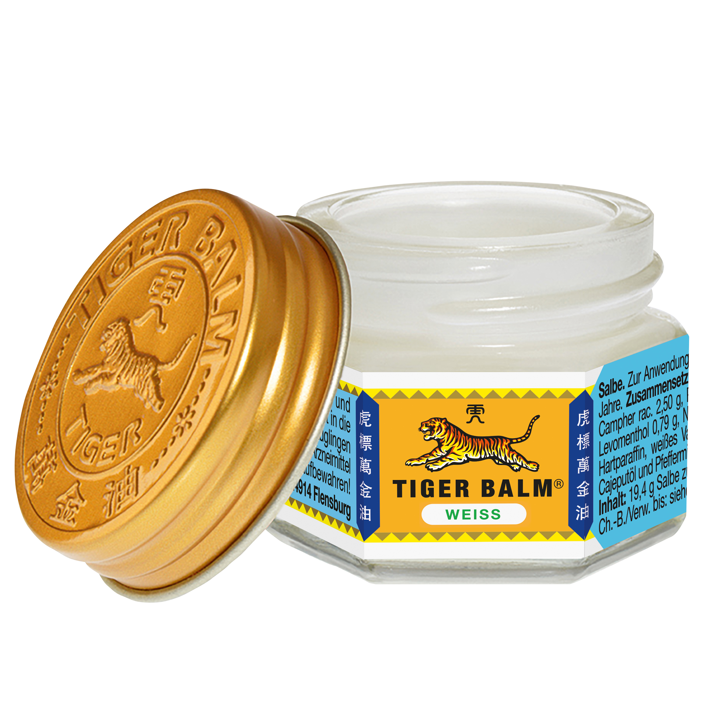 Im Fernen Osten wurden bereits vor Tausenden von Jahren die Heilkräfte der Natur wirkungsvoll genutzt. Auf Basis diesen Wissens wurde der außergewöhnliche TIGER BALM WEISS entwickelt. Mit einer besonderen Kombination aus fünf Wirkstoffen trägt der Balsam zu einer Verbesserung des Befindens bei Erkältungsbeschwerden bei und fördert zudem die Hautdurchblutung bei Muskel- und Gelenkbeschwerden. Bei Bronchialbeschwerden die Brust mit TIGER BALM WEISS einreiben (ab 12 Jahren). Bei ersten Anzeichen einer Erkältung die Partie unterhalb der Nase bestreichen. Das enthaltene Menthol ruft einen kühlenden Effekt hervor, das Pfefferminzöl löst den Schleim und kann so die Atemwege befreien. Bei Spannungskopfschmerzen werden häufig Menthol-Produkte auf den Schläfen eingesetzt.