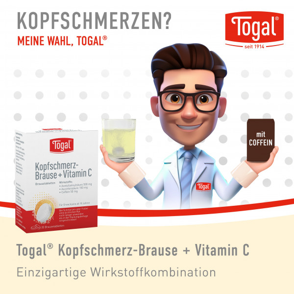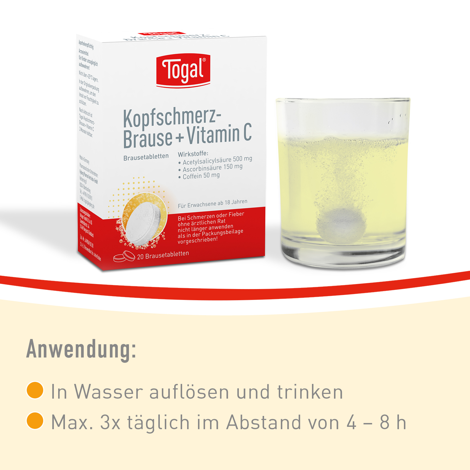 Zur Anwendung bei Erwachsenen ab 18 Jahren. Togal® Kopfschmerz-Brause + Vitamin C ist nicht für die Anwendung bei Kindern und Jugendlichen unter 18 Jahren vorgesehen.