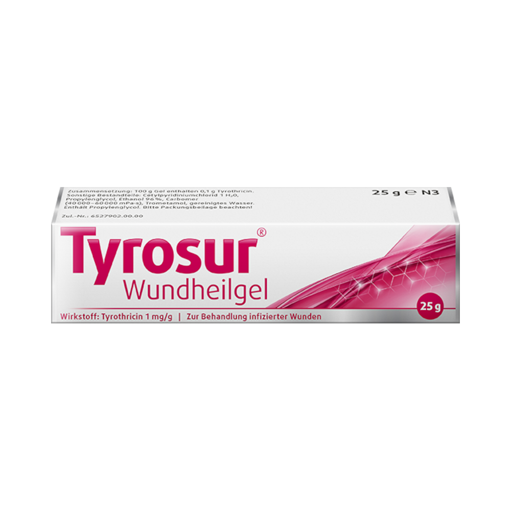 Tyrosur Wundheilgel ist ein Wundbehandlungsmittel. Tyrosur Wundheilgel wird angewendet zur lindernden Behandlung von kleinflächigen, oberflächlichen, wenig nässenden Wunden mit bakterieller Superinfektion mit Tyrothricin-empfindlichen Erregern wie z.B. Riss-, Kratz-, Schürfwunden.