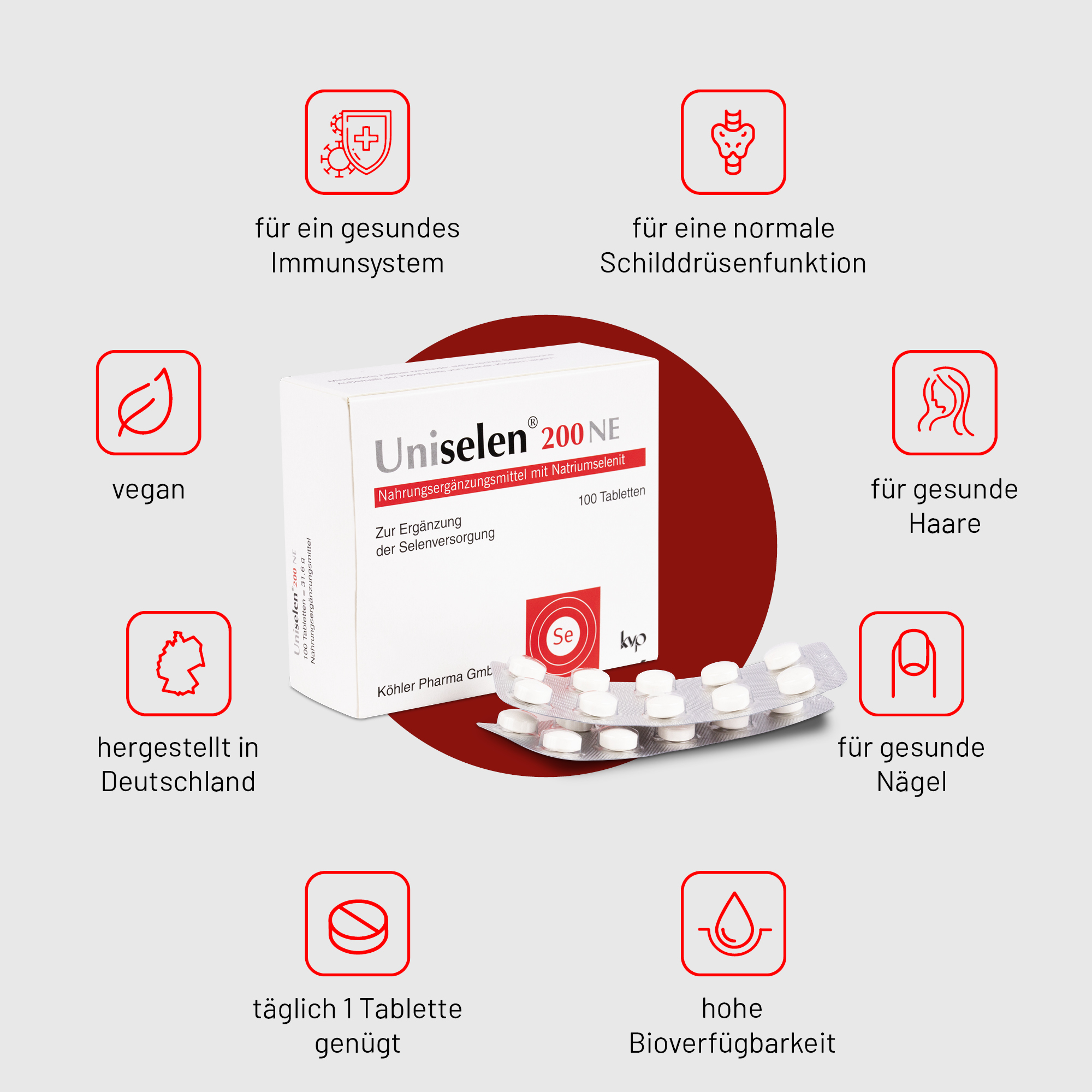 UNISELENNahrungsergänzungsmittel sind kein Ersatz für eine ausgewogene und abwechslungsreiche Ernährung und eine gesunde Lebensweise. Die angegebene empfohlene tägliche Verzehrsmenge darf nicht überschritten werden. Außerhalb der Reichweite von kleinen Kindern aufbewahren.