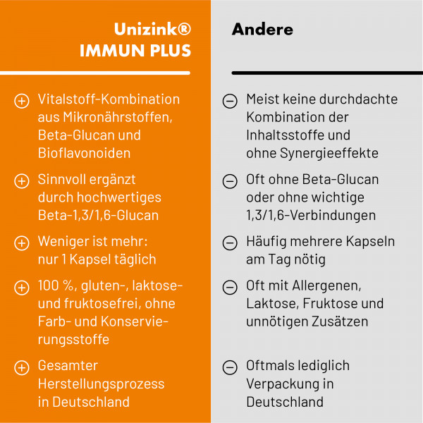 Zink ist das Basiselement für ein gesundes Immunsystem, indem es unter anderem die körpereigene Produktion wichtiger Abwehrzellen (T-Zellen) positiv beeinflusst. Beta-Glucan zählt zur Gruppe der Vielfachzucker. Unter Ernährungswissenschaftlern besteht ein zunehmendes Interesse an diesem Naturstoff, da er die wichtigsten Immunzellen unseres Körpers, die Makrophagen, aktivieren kann.