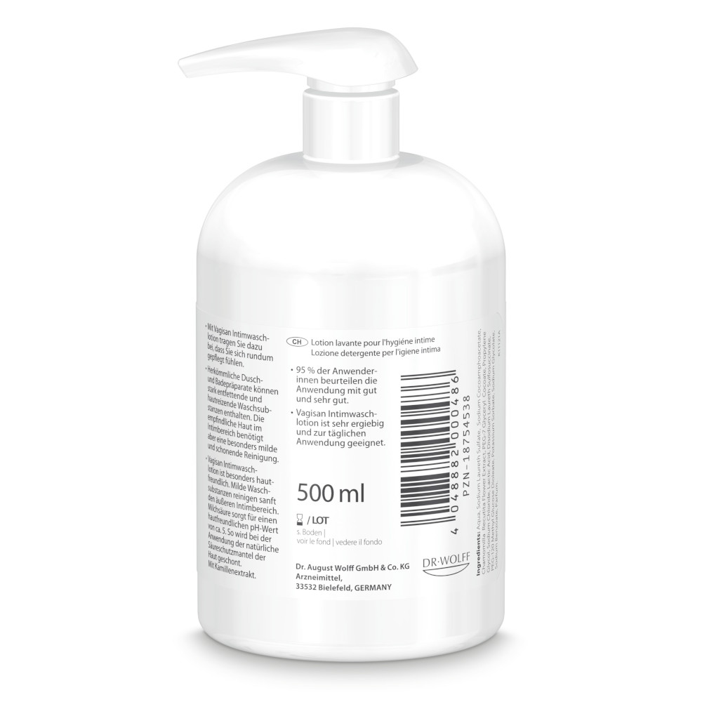 Vagisan Intimwaschlotion ist eine besonders sanfte Waschlotion für den äußeren Intimbereich. Der natürliche Säureschutzmantel bleibt durch die milden Inhaltsstoffe bei der Intimreinigung erhalten, und die empfindliche Haut im Intimbereich wird geschont, ein wertvoller Beitrag für eine gesunde Intimhygiene. Zusätzlich beruhigt der in der Waschlotion enthaltene Kamillenextrakt während der Reinigung im Intimbereich die empfindliche Haut. Vagisan Intimwaschlotion ist sehr gut verträglich und eignet sich auch bei trockener Haut für die tägliche Anwendung.