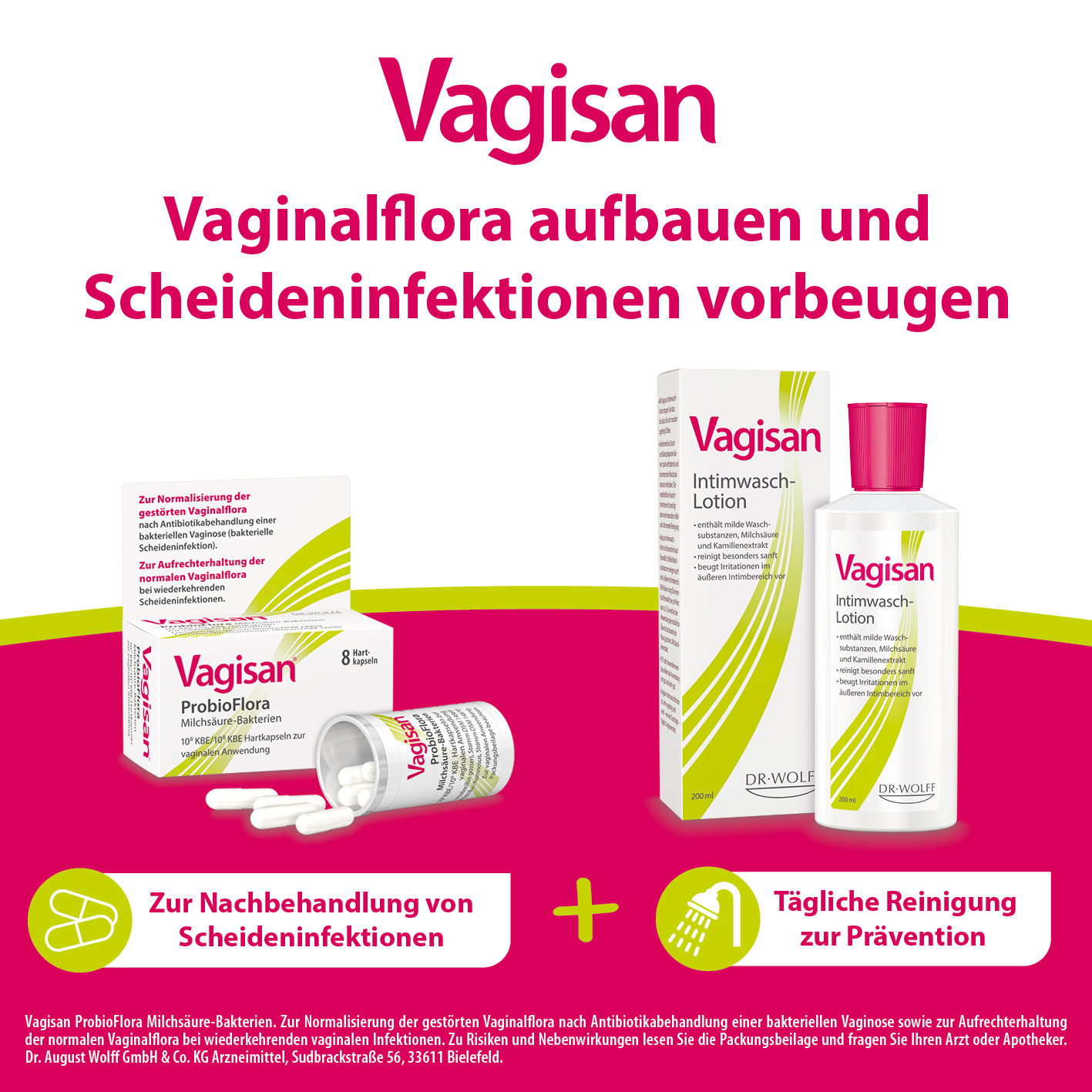 Zur Normalisierung der gestörten Vaginalflora nach Antibiotikabehandlung einer bakteriellen Vaginose (bakterielle Scheideninfektion); zur Aufrechterhaltung der normalen Vaginalflora bei wiederkehrenden Scheideninfektionen. Zu Risiken und Nebenwirkungen lesen Sie die Packungsbeilage und fragen Sie Ihren Arzt oder Apotheker. Dr. August Wolff GmbH & Co. KG Arzneimittel, Sudbrackstr. 56, 33611 Bielefeld