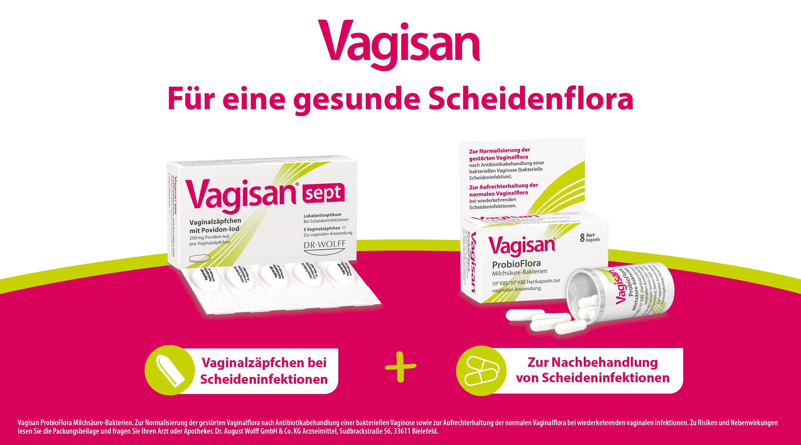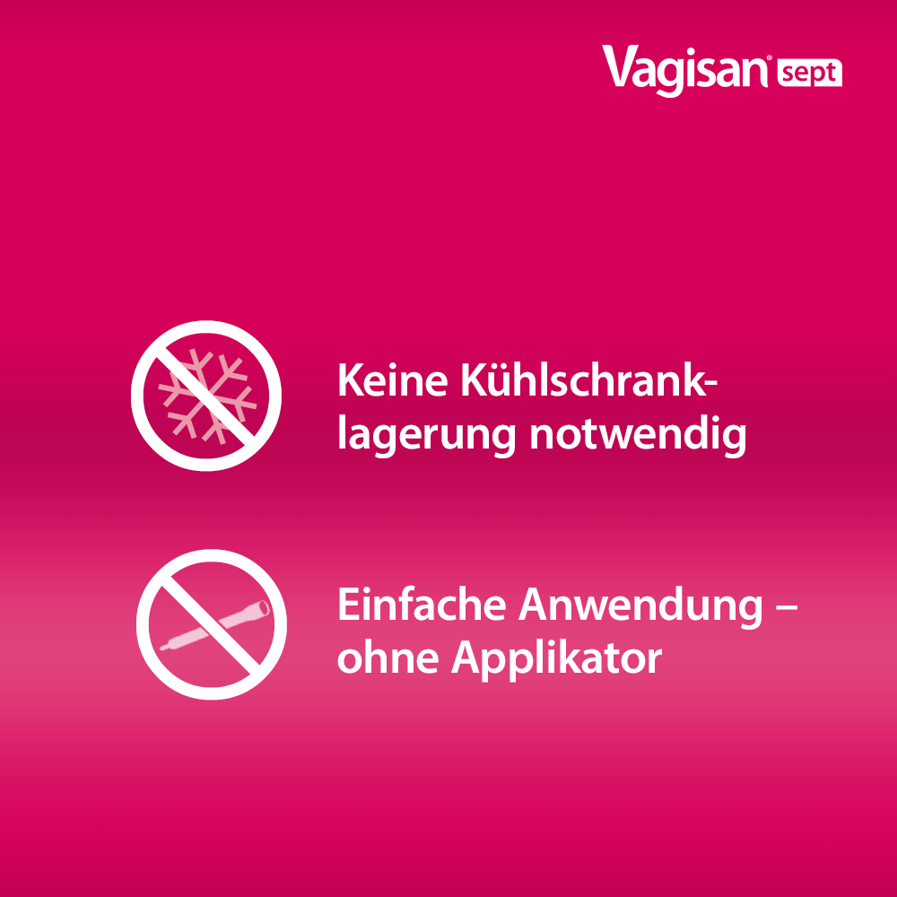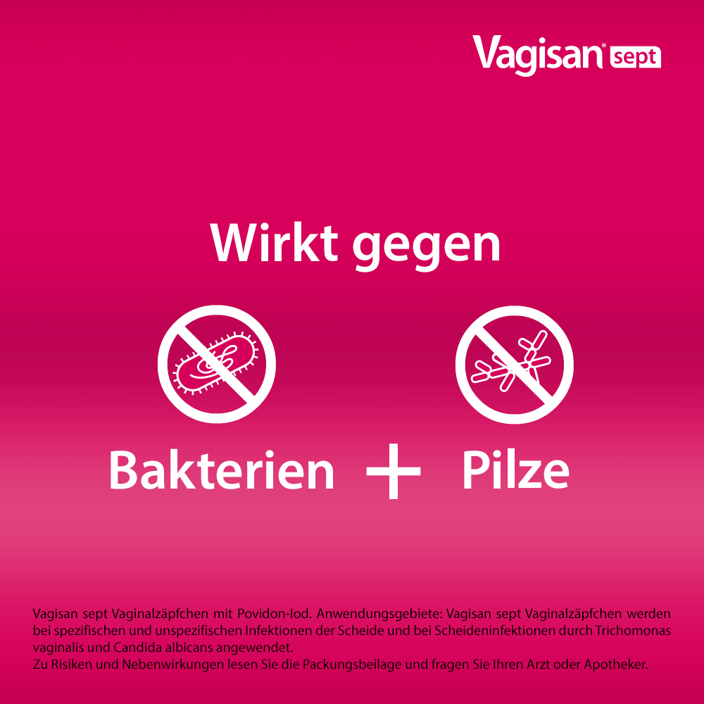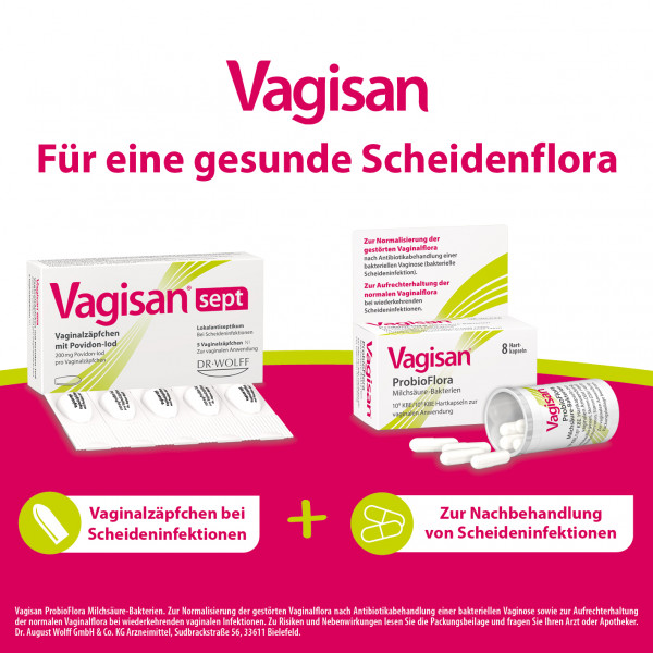 Vagisan sept ist ein einzigartiges vaginales Antiseptikum mit Povidon-Iod (PVP-Iod), welches direkt die Ursache der Scheideninfektion behandelt. Das breite Wirkspektrum erfasst Bakterien, Pilze und Hefen sowie einige Viren und Protozoen. Daher kann es bei einer Vielzahl an Scheideninfektionen angewendet werden, unter anderem bei spezifischen und unspezifischen Scheideninfektionen, Infektionen durch Trichomonaden wie Trichomonas vaginalis (Trichomoniasis) und Mischinfektionen. Hier ist nicht nur eine Erregerart für die Infektion verantwortlich, wie z. B. von Bakterieller Vaginose oder Scheidenpilz bekannt, sondern Bakterien und Pilze sind gleichzeitig an einer Infektion beteiligt. Auch kann Vagisan sept bei bakteriellen Infektionen durch Gardnerella vaginalis, Bacteroides, Prevotella und Mycoplasma hominis empfohlen werden. PVP-Iod wirkt trotz Biofilmen und wird daher auch bei rezidiv auftretenden, d. h. wiederkehrenden, Infektionen eingesetzt. Vagisan sept ist wiederholt anwendbar, da die Entwicklung von Resistenzen gegenüber PVP-Iod nicht bekannt ist. Das Zäpfchen ist das einzige vaginale Antiseptikum mit dem Wirkstoff Povidon-Iod, eine Komplexverbindung des Iods mit dem Träger Povidon, welche eine gute Verträglichkeit aufweist. Vagisan sept ist ohne Applikator leicht einzuführen, wirkt außerdem schnell und ist gut verträglich.