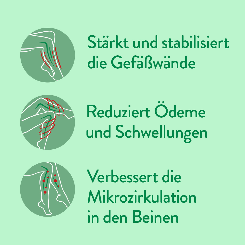 Anwendung: Das Arzneimittel ist ein Venenpräparat. Durch die antiödematöse (gewebsentwässernde) Wirkung werden Ödeme (Beinschwellungen) reduziert. Beschwerden wie z. B. schwere, müde Beine und Spannungsgefühle sowie Kribbeln in den Beinen werden somit gelindert. Zur Anwendung bei Beschwerden in Folge von Erkrankungen der Beinvenen (chronische Veneninsuffizienz): Behandlung von Beinschwellungen (Ödemen) und Linderung bei schweren, müden Beinen, Spannungsgefühlen und Kribbeln.