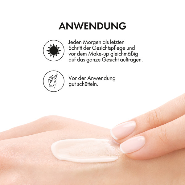 - Der Sonnenschutz mit LSF 50 wirkt sonnenbedingten Hautschäden entgegen, indem durch UV-Strahlung hervorgerufenen Pickelmalen vorgebeugt wird.