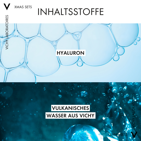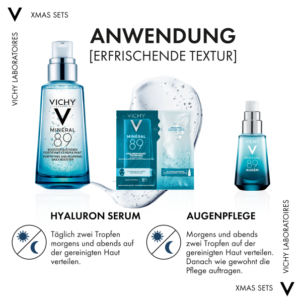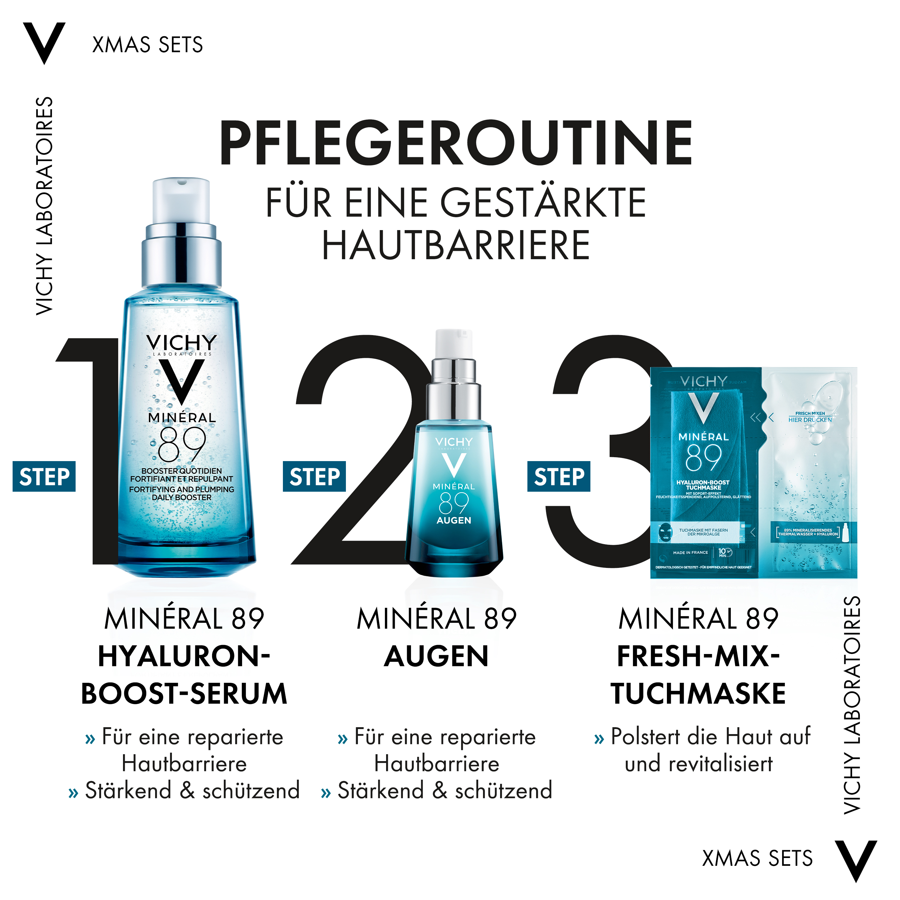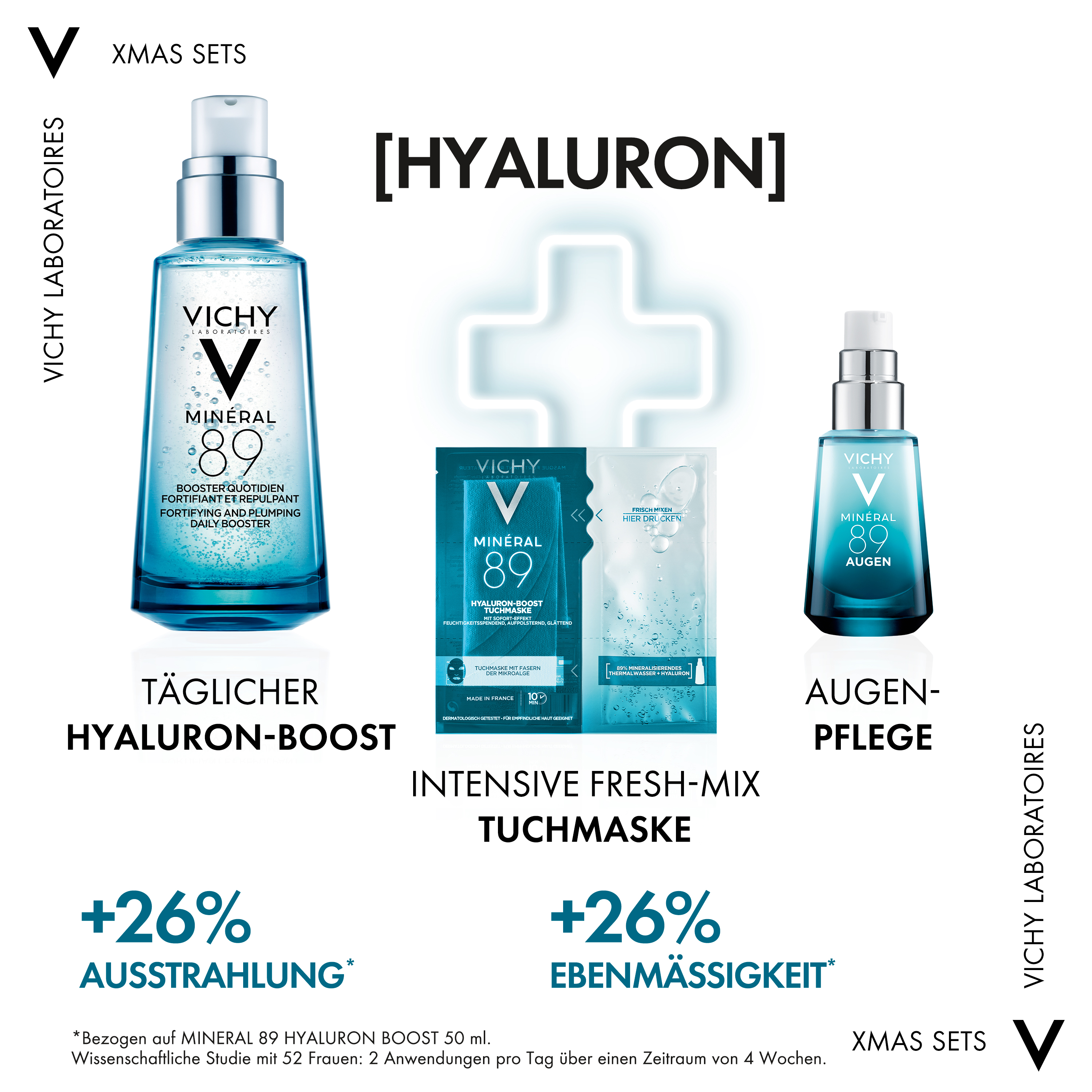 Das Vichy XMAS MINÉRAL 89 Pflege-Set ist das perfekte Weihnachtsgeschenk. Der MINÉRAL 89 Hyaluron-Boost 50 ml sorgt für die Regeneration der natürlichen Hautschutzbarriere, spendet viel Feuchtigkeit und entfaltet dabei eine stärkende Wirkung. Mit dem MINÉRAL 89 Augenserum 15 ml erscheint die Haut glatter und Augenringe werden gemildert – für einen langanhaltenden, strahlenden Blick. Die enthaltene MINÉRAL 89 Fresh-Mix Tuchmaske 29 g polstert die Haut auf, wirkt revitalisierend und spendet der Haut Feuchtigkeit. Natürliches Hyaluron in Verbindung mit der hochkonzentrierten Kraft von 89% Thermalwasser macht die MINÉRAL 89 Pflegeserie zu einem einzigartigen Frische-Kick für die Haut.