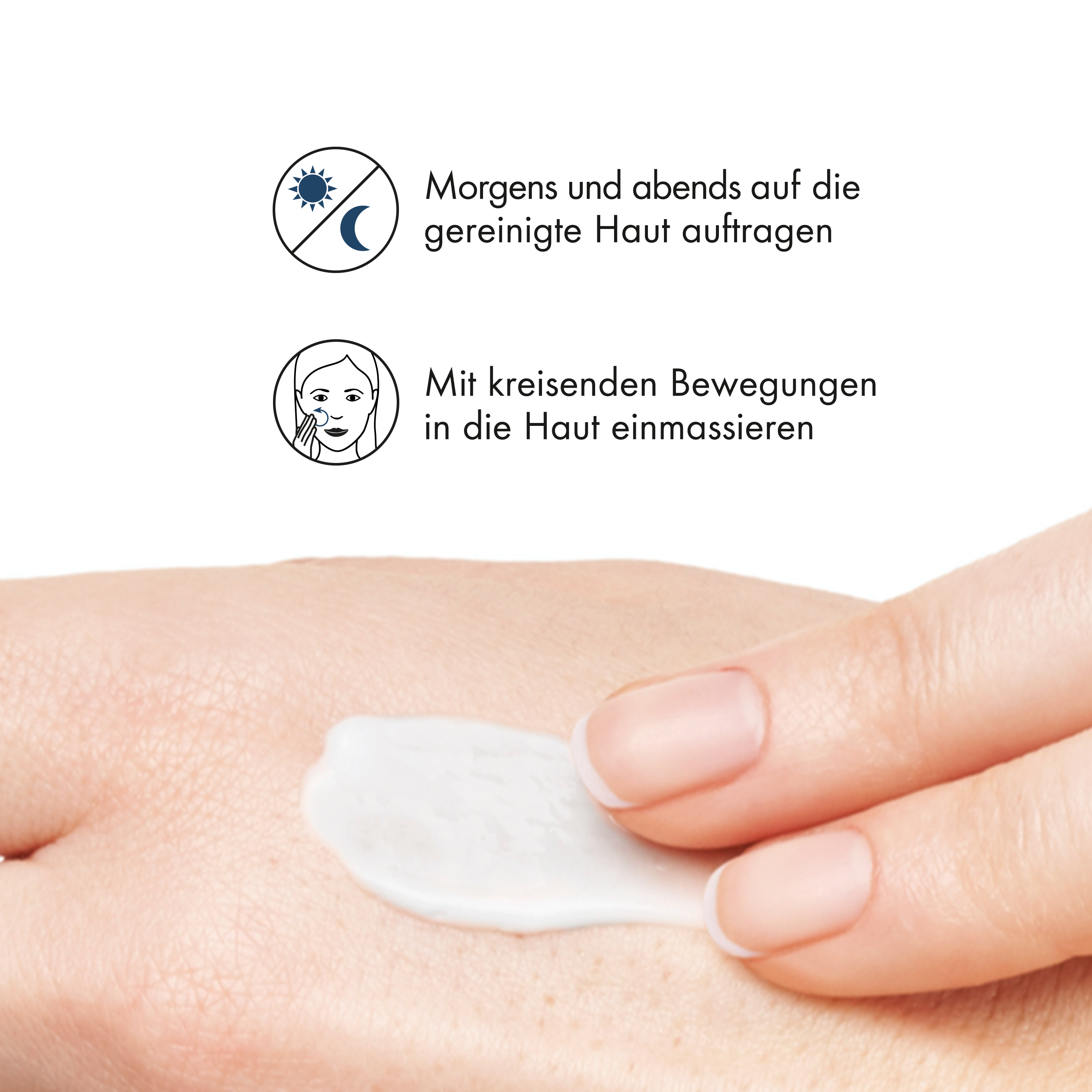 Morgens und/oder abends auf die gründlich gereinigte Haut auftragen. Verteilen Sie einige Tupfer Creme über das ganze Gesicht. Massieren Sie die Creme mit sanften Kreisbewegungen von innen nach außen ein. Für den extra Feuchtigkeits-Boost vorher den Mineral 89 Booster verwenden.