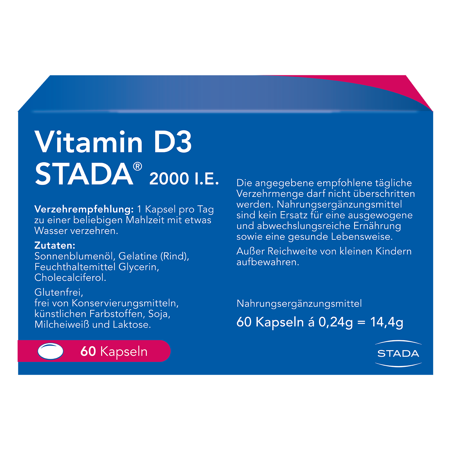 2000 I.E. Vitamin D3 pro Kapsel Zutaten Sonnenblumenöl, Gelatine (Rind), Feuchthaltemittel Glycerin, Cholecalciferol.