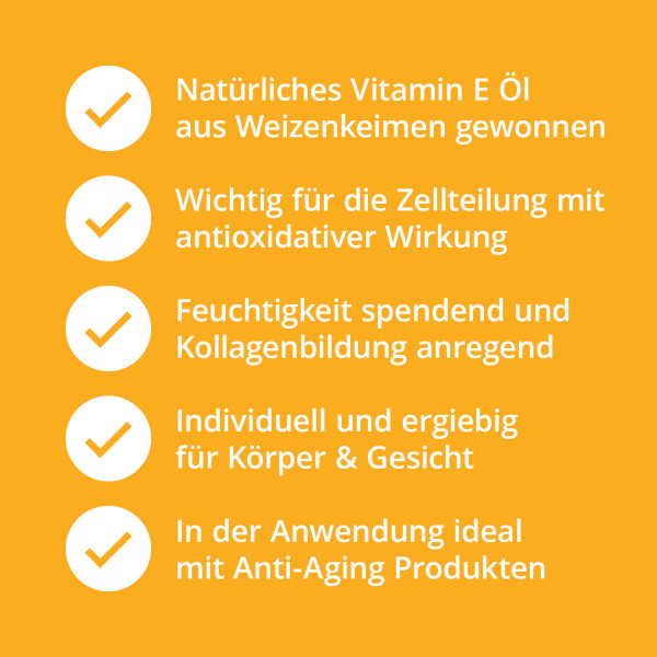 - Das hochwertige Vitamin E Öl aus Weizenkeimen pflegt Ihre Haut Tag für Tag natürlich streichelzart.