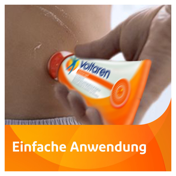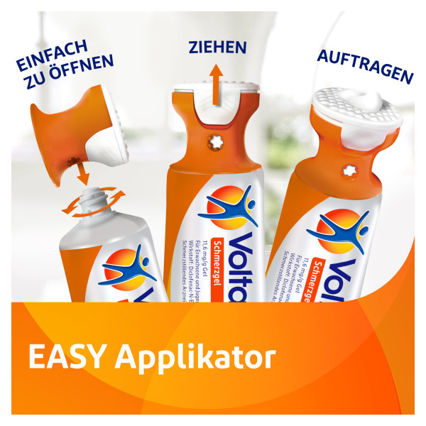 Anwendungsgebiete von Voltaren Schmerzgel mit EASY-Applikator bei ErwachsenenZur symptomatischen Behandlung von Schmerzen: bei akuten Zerrungen, Verstauchungen oder Prellungen infolge stumpfer Traumen, z.B. Sport- und Unfallverletzungender gelenknahen Weichteile (z. B. Schleimbeutel, Sehnen, Sehnenscheiden, Bänder, Muskelansätze und Gelenkkapseln) bei Arthrose der Knie-und Fingergelenkebei Epicondylitis (Entzündung der Sehnenansätze im Bereich des Ellenbogens, auch Tennisellenbogen bzw. Golferellenbogen genannt)bei akuten Muskelschmerzen (z.B. im Rückenbereich)Anwendungsgebiete von Voltaren Schmerzgel mit EASY-Applikator bei Jugendlichen über 14 Jahren Zur lokalen, symptomatischen Kurzzeitbehandlung von Schmerzen: bei akuten Zerrungen, Verstauchungen oder Prellungen infolge eines stumpfen Traumas Bitte beachten Sie dazu auch die Packungsbeilage. Die bewährte 3-fach-Wirkung von Voltaren Schmerzgel Beim Auftragen dringt der Wirkstoff Diclofenac tief in die Haut ein und konzentriert sich gezielt an der entzündeten Stelle. Hier entfaltet das Schmerzgel seine bewährte 3-fach-Wirkung. Das Diclofenac Schmerzgel Stoppt den SchmerzBekämpft die EntzündungBeschleunigt die Heilung Einfache Anwendung ohne Händewaschen nach dem Auftragen. Der EASY Applikator ermöglicht eine einfache und hygienische Anwendung – Mit Hilfe des Applikators kann das Gel easy und direkt an der schmerzenden Stelle aufgetragen werden, ohne sich danach die Hände zu waschen. Und so funktioniert´s: 1.Transparente Schutzkappe abziehen 2. Applikator abdrehen 3. Mit seitlicher, sternförmiger Vertiefung das Sicherheitssiegel der Tube entfernen 4. Applikator wieder auf die Tube drehen. Zum Öffnen weißen Teil des Applikators hochziehen 5. Für die erfolderliche Schmerzgel Menge Tube leicht zusammendrücken 6. Applikator schließt sich beim Auftragen mit leichtem Druck automatisch 7. Bei Bedarf Applikator mit Baumwoll-oder Papiertuch reinigen Dosierung und Dauer der Anwendung Tragen Sie Voltaren Schmerzgel in Abhängigkeit von der Schmerzintensität drei- bis viermal täglich auf. Je nach Größe der zu behandelnden schmerzhaften Stelle ist eine kirsch- bis walnussgroße Menge erforderlich. Anschließend sollten die Hände gewaschen werden, außer diese sind die zu behandelnde Stelle. Bevor die Stelle mit Kleidung bedeckt wird, sollte das Gel einige Minuten auf der Haut trocknen.Die Dauer der Anwendung richtet sich nach den Symptomen und der zugrundeliegenden Erkrankung.