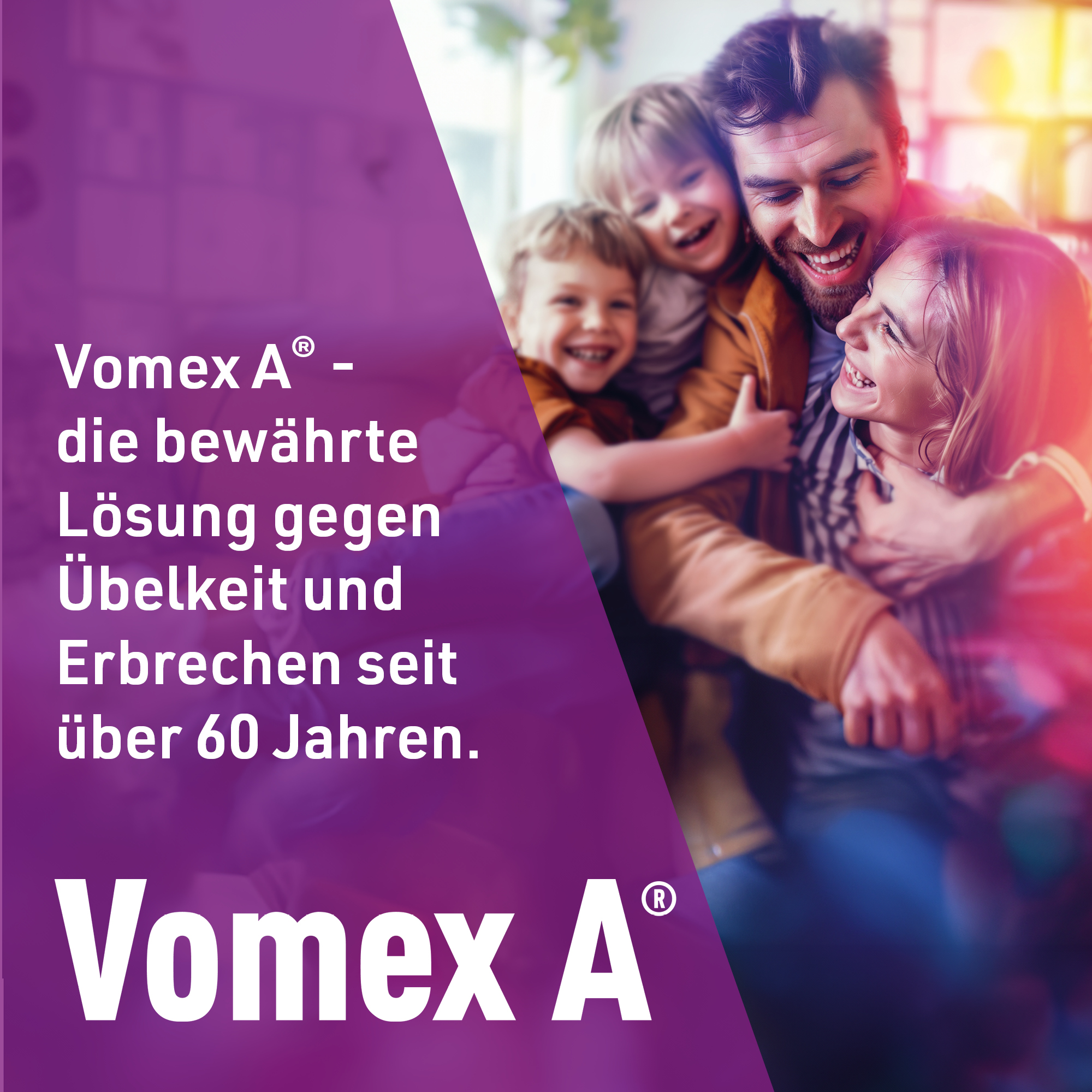 Vomex A Dragees 50 mg, überzogene Tabletten. Wirkstoff: Dimenhydrinat. Anwendungsgebiete: zur Vorbeugung und Behandlung von Übelkeit und Erbrechen unterschiedlichen Ursprungs. Der Klassiker mit schnellem Wirkeintritt.