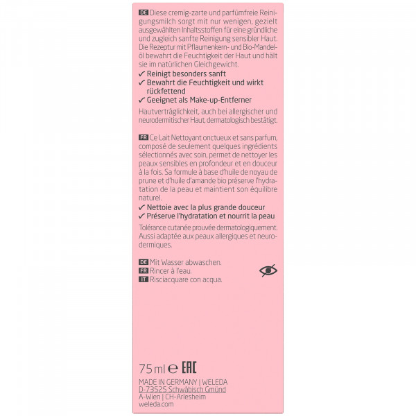 Weleda Mandel Sensitiv ReinigungsmilchSanfte porentiefe Naturkosmetik Reinigung für sensible Gesichtshaut, auch zur schonenden Entfernung von Make-up geeignet• Reinigt besonders schonend• Wirkt rückfettend• Zur Entfernung von Make-up geeignetBeschreibung: Die sanfte Reinigungsmilch für einen reinen Teint: Die sahnige, unparfümierte Emulsion reinigt besonders mild, wirkt rückfettend und hält sensible Haut im gesunden Gleichgewicht. Zusätzlich pflegt sie die Haut sanft mit mildem Mandel- und Pflaumenkernöl.Anwendung:Tragen Sie morgens und abends mit den Fingerspitzen oder einem feuchten Wattepad eine kleine Menge auf Gesicht, Hals und Dekolleté mit kleinen, kreisenden Bewegungen sanft auf – den Augenbereich dabei aussparen. Mit lauwarmem Wasser oder mit einem feuchten Wattepad sanft abnehmen.