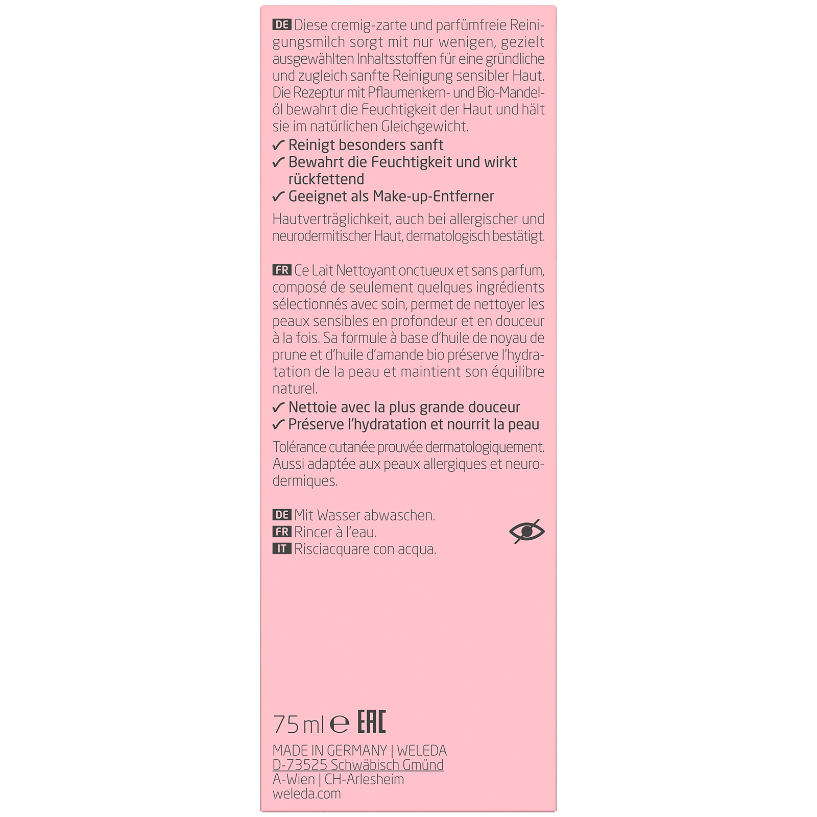 - Sanfte, parfümfreie Reinigungsmilch mit Pflaumenkern- und Mandelöl bewahrt das Hautmikrobiom und spendet Feuchtigkeit