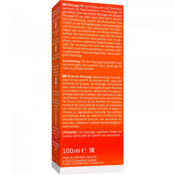 Haben Sie Lust auf Bewegung? Eine wärmende Massage vor oder nach dem Sport mit Weleda Arnika-Massage-Öl fördert die Durchblutung, lockert die Muskulatur und schützt so vor unangenehmem Muskelkater. Die Komposition mit Auszügen aus Arnikablüten und Birkenblättern, sowie Sonnenblumen- und Olivenöl kräftigt die Hautfunktionen und hält die Haut elastisch. Angenehm aktivierend ist der natürliche Lavendel- und Rosmarinduft. Masseure und Sportler schätzen das Arnika-Massageöl.