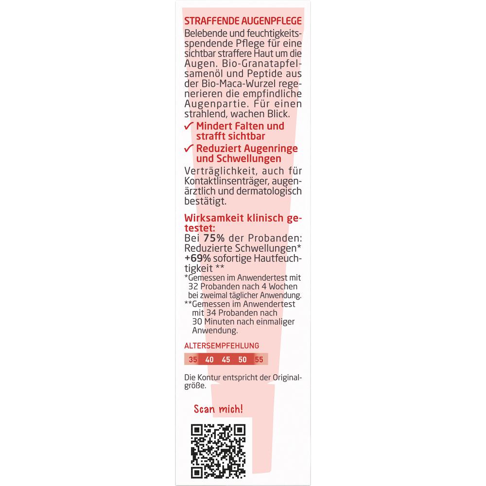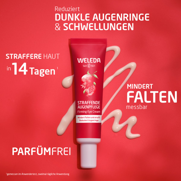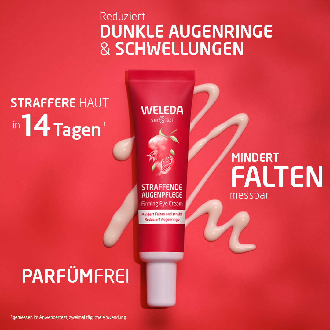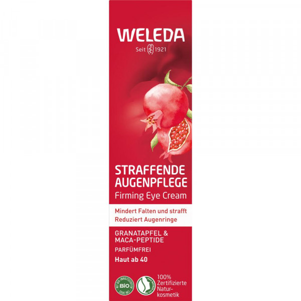 Weleda Straffende Augenpflege mit Granatapfel & Maca-Peptide Natural Anti Aging Naturkosmetik Augencreme mindert Falten, Augenringe & Schwellungen, strafft die Haut um die Augen, parfümfrei • Mindert Falten und strafft sichtbar • Reduziert Augenringe • Reduziert Schwellungen um die Augen • Für einen strahlend wachen Blick +75% bestätigen: Schwellungen um die Augen gehen zurück* +84% bestätigen: Die Pflege beruhigt die Haut* +81% bestätigen: Stärkt die natürliche Ausstrahung der Haut* *Verbraucherstudie mit 32 Probandinnen nach vier Wochen bei zweimal täglicher Anwendung Beschreibung: Bio-Granatapfelsamenöl und Peptide aus Bio-Maca-Wurzel unterstützen den hauteigenen Regenerationsprozess. Die hautberuhigende Pflege verbessert die Elastizität der empfindlichen Haut im Augenbereich und lässt sie natürlich strahlen. Parfümfrei. Verträglichkeit, auch für Kontaktlinsenträger, augenärztlich und dermatologisch bestätigt. Anwendungstipp: Eine perlengroße Menge sanft um die Augenpartie einklpofen.