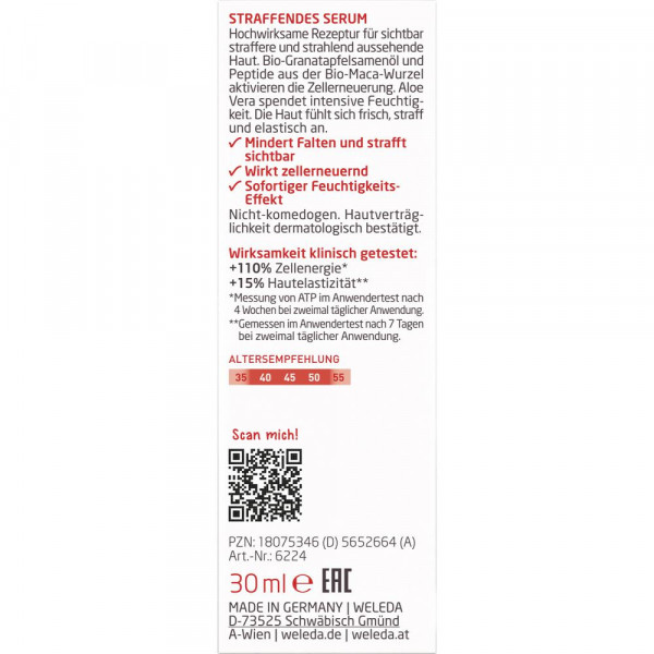 Weleda Straffendes Serum Granatapfel & Maca-Peptide Natural Anti Aging Naturkosmetik Gesichtsserum mindert Falten und strafft, spendet Feuchtigkeit & verbessert die Elastizität • Erhöht die Zellenergie • Mindert Falten und strafft sichtbar • Sofort glatteres Hautgefühl • Sofortiger Feuchtigkeitseffekt +110% mehr Zellenergie* *Messung von ATP im Anwendertest nach vier Wochen bei zweimal täglicher Anwendung +15% mehr Hautelastizität* *Gemessen im Anwendertest nach sieben Tagen bei zweimal täglicher Anwendung +79% bestätigen: geringere Faltentiefe* *Gemessen im Anwendertest mit 33 Probandinnen nach vier Wochen bei zweimal täglicher Anwendung +76% bestätigen: positive Wirkung* *Gemessen im Anwendertest mit 34 Probandinnen nach vier Wochen bei zweimal täglicher Anwendung Beschreibung: Bio-Granatapfelsamenöl und Peptide aus Bio-Maca-Wurzel aktivieren die Zellerneuerung. Für ein frisches und straffes Hautgefühl. Verbessert die Spannkraft der Haut. Nicht komedogen. Hautverträglichkeit klinisch und dermatologisch bestätigt. Anwendungstipp: Sanft in die gereinigte Haut von Gesicht, Hals und Dekolleté einklopfen. Danach Tages- oder Nachtpflege auftragen.