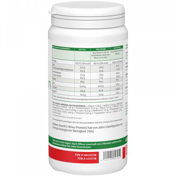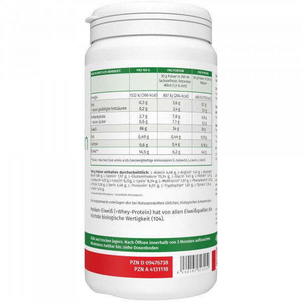 Durchschnittliche Nährwertepro 100 gpro Portion (30 g Pulver in 250 ml lactosefreier, fettarmer Milch 1,5% Fett)pro Portion (30 g Pulver in 250 ml Wasser)