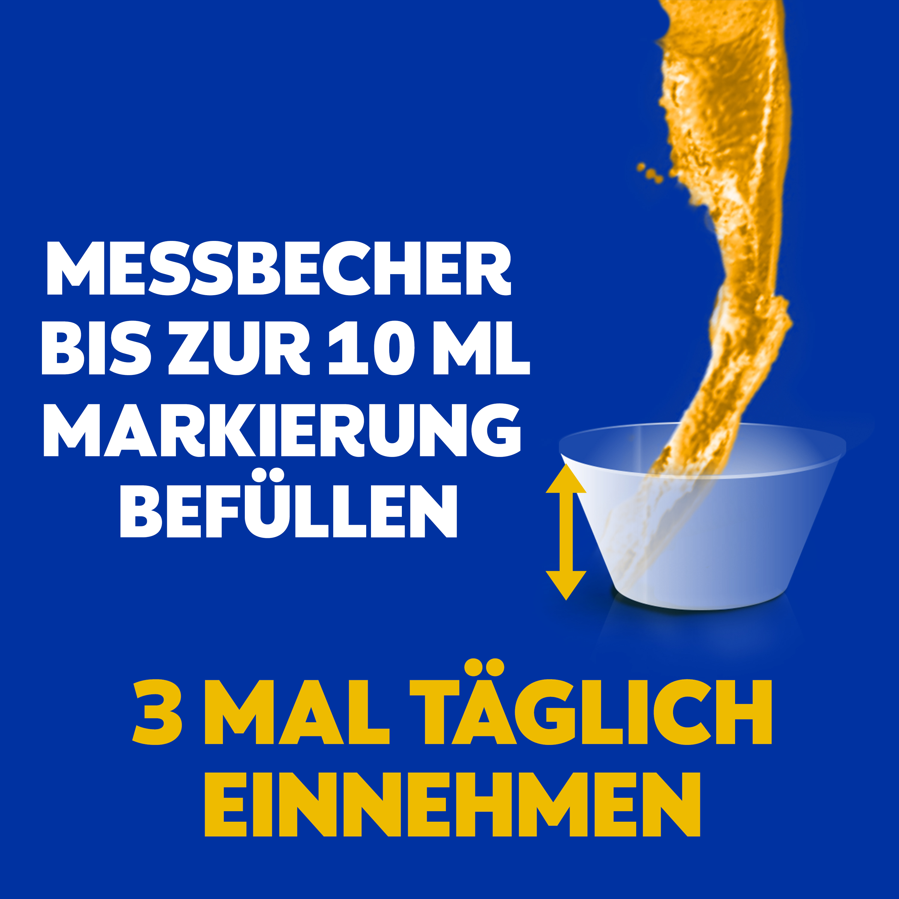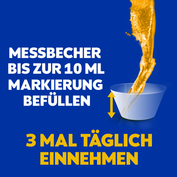 EMPFOHLENE DOSIS: Erwachsene und Jugendliche ab 12 Jahren nehmen 3-mal täglich 10 ml (gemäß Markierung des Messbechers) ein. Nehmen Sie nicht mehr als die empfohlene Dosis ein. Es wird empfohlen, die letzte Dosis vor dem Schlafengehen einzunehmen.