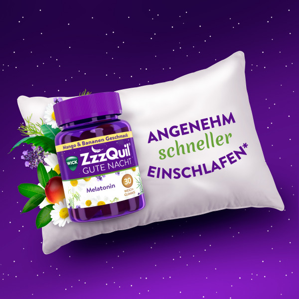 Manchmal halten uns jedoch Sorgen des Tages abends vom Einschlafen ab. Wie es der Zufall will, scheinen die schlaflosen Nächte immer dann zu kommen, wenn man seine ganze Energie braucht, um den kommenden Tag zu bewältigen. Für solche Zeiten haben wir WICK ZzzQuil Gute NachtTM entwickelt, ein Nahrungsergänzungsmittel mit Melatonin, das Ihnen hilft, schneller einzuschlafen*, ohne dass Sie am nächsten Tag müde sind. Melatonin ist ein körpereigenes Hormon, es verursacht keinen Gewöhnungseffekt. Melatonin hilft, unseren Schlaf-Wach-Rhythmus zu regulieren. Wir haben unsere Weichgummis mit 1,0 mg Melatonin, 30 mg Baldrianextrakt, 10 mg Kamillenextrakt, 10 mg Lavendelextrakt und 1,4 mg Vitamin B6 (das sind 100 % der RM) entwickelt. Die Weichgummis enthalten keine künstlichen Farb-, Aroma- oder Konservierungsstoffe - die Weichgummis sind in den natürlichen Geschmacksrichtungen Mango und Banane sowie in der originalen Geschmacksrichtung Waldfrucht erhältlich. Außerdem sind sie laktose- und glutenfrei. WICK ZzzQuil Gute NachtTM ist einfach einzunehmen - 30 Minuten vor dem Schlafengehen 1 Weichgummi im Mund zergehen lassen. Geeignet ab 18 Jahren. Nur einzunehmen, wenn danach 6 Stunden Schlaf ermöglicht werden können. Bitte lesen Sie vor der Anwendung die Packungsbeilage. *Melatonin hilft dabei, die Einschlafzeit zu verkürzen. Der positive Effekt wird durch die Einnahme von 1 mg NATÜRLICHER MANGO- UND BANANENGESCHMACK: Tropischer Geschmack von Mango und Banane, natürliche Aromastoffe sorgen für ein Geschmacksprofil aus Mango & Banane, frei von Farb- und Konservierungsstoffen *Melatonin hilft dabei, die Einschlafzeit zu verkürzen. Der positive Effekt wird durch die Einnahme von 1 mg Melatonin kurz vor dem Schlafengehen erzielt Melatonin ist ein körpereigenes Hormon, das Ihnen hilft, schneller einzuschlafen, ohne dass Sie am nächsten Tag müde sind. Melatonin verursacht keinen Gewöhnungseffekt. Melatonin hilft, unseren Schlaf-WachRhythmus zu reguliere