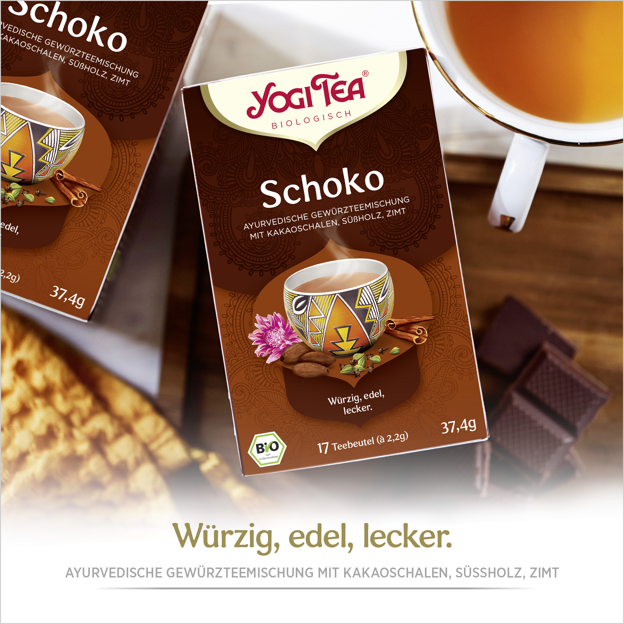 Die Azteken wussten um die Bedeutung von Gewürzen für die Schokoladenzubereitung. Für die Zubereitung von \"Xocoatl\", ihrem ehrwürdigen \"Getränk der Götter\" mischten sie Kakao mit Gewürzen wie Vanille, südamerikanischem Zimt und Chili. In dieser Tradition haben wir unseren YOGI TEA Schoko entwickelt. Er ist ein echter Insider-Tipp, fast ein Kultobjekt für die, die ihn kennen und lieben gelernt haben: Schoki's best drink. Wir benutzen für das Rezept Kakaoschalen mit vollem Geschmack, aber nur einem verschwindend geringen Gehalt an Theobromin, dem 'Kakao-Koffein'. In Zusammenarbeit mit der Gepa werden sie nach den Kriterien des Fairen Handels produziert. Zusätzlich kommen alle wunderbaren YOGI TEA-Gewürze dazu. Kein Wunder, YOGI TEA Schoko ist bei Kindern beliebt, und bei allen anderen Schleckermäulern ebenso.