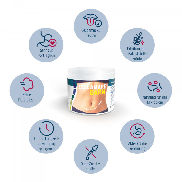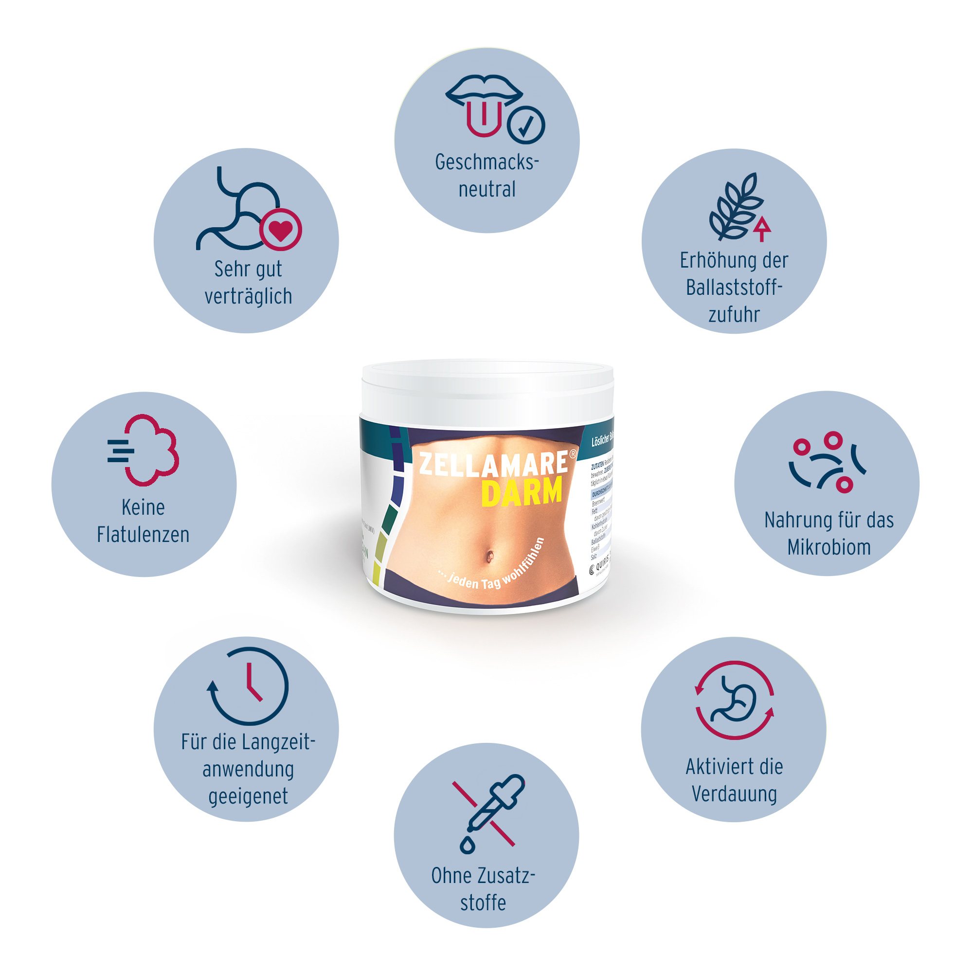 ZELLAMARE® DARM ist eine der bekömmlichsten Möglichkeiten, die tägliche Ballaststoffzufuhr zu erhöhen. Ein patentiertes Herstellungsverfahren garantiert die hohe Reinheit. ZELLAMARE® DARM ist ein deutsches Qualitätsprodukt, dessen Qualität nach strengen, standardisierten Verfahren überwacht wird. ZELLAMARE® DARM